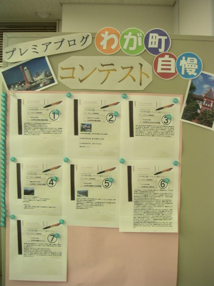 以前ブログで「わが町自慢コンテスト」という コンテストを行いました。 皆さんそれぞれわが町の自慢をブログでつづっていただいたものに、受講生の皆さんから投票をいただいています。 須磨のこと、麻耶山のこと、家庭菜園のこと・・・ 皆さんそれぞれ素晴らしい自慢を書いていただいています(*^_^*) 同じ町に住んでいるのに、知らないことも結構あり 勉強になりました。 まだ投票されていない方は教室で 受け付けておりますので、よろしくお願いします! ちなみに・・・ 教室に掲示している皆さんのブログを印刷したものの 上のタイトル(右の写真参照)は、 石岡先生と原の合作です☆ ワードで作りましたよ♪ いい感じでしょ(*^^)v 人と一緒に何かを作るって久しぶりのことだったので、 なんだか嬉しくなりました。
