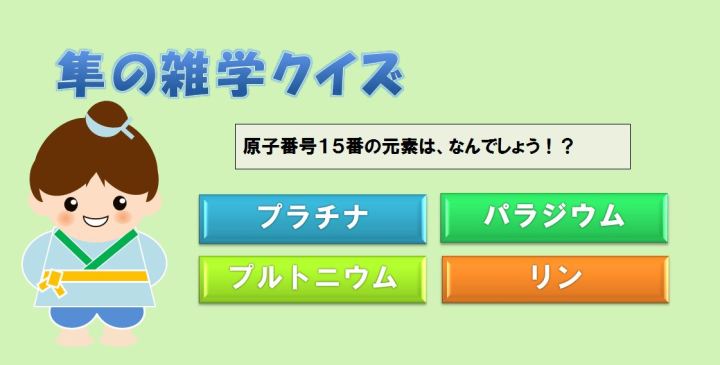 日本の研究機関が、新元素を発見。 「ニホニウム」と名付けられたそうな。。 そこで雑学問題!! 15にちなんで、