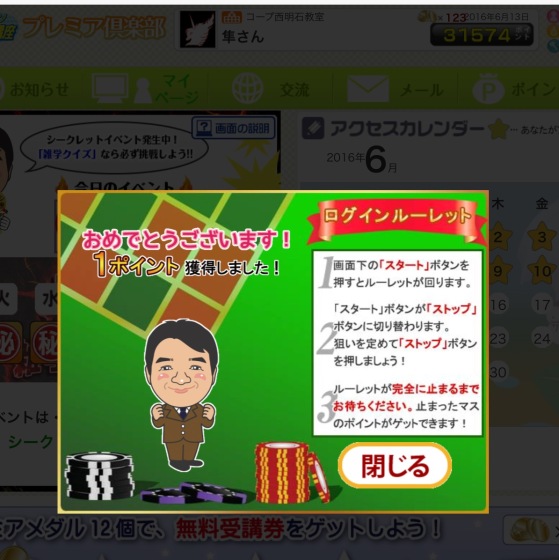 2016年06月13日 09:36 コメント 1 件 やって来ました、ルーレット!!雑学クイズでは無いですよ~ ルーレットですよ~ では、行きますか!! スタート。 クル、クル、、、 クル、クル、、、 クル、クル、、、 ハイ、ストップ。 ・・ ・・ ・ ・ おめでとうございます!! 1ポイント獲得です(^_-)-☆ めでたくないよ~~ まだ10ポイント出たこと無いよ~~ では、行きますか!? お決まりの・・ 10ポイント、まだ出たこと無い組、、 集まれ~~~~~~~~~~~~(*^。^*) 画像は、iPad Airです。 タイミングが合わなかった;^_^A