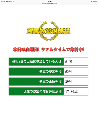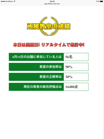 2016年06月12日 11:25 コメント 0 件 あと2問・教室訪問。教室訪問させていただきました。 昨年の優勝教室、イズミヤ西神戸教室さんです。 あと2問・最後まで頑張りましょう!