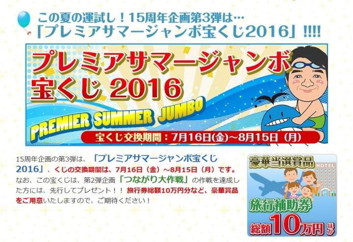 2016年06月18日 16:12 コメント 5 件 つながり大作戦知っていますか?こんにちは 豊橋教室のブログへようこそ! P-1グランプリも終わって、 なんとなく、ホッとするひと時。 そして、すぐに始まった、 つながり大作戦。 皆さん、ご存知ですか? 教室にいらしている方には、少しずつお願いをしています。 プロフィールの設定です。 トップ画面の、つながり大作戦のバナーから確認してもらうと、 ミッションが、確認してもらえます。 ミッションが達成すると、 「プレミアサマー宝くじ」がゲットできます。 昨年も、大好評でした宝くじ。 今年の夏もありますよ。 今年の夏は、去年以上の素敵な賞品! 特賞は、10万円相当の旅行券が当たります。 すごい! 教室では、すでに宝くじを3枚ゲットする権利をいただいた方が、 たくさんいます。 ミッションの仕方がわからない方は、 ぜひ、7月7日プレミアイベントにご参加くださいね。 その日でも、ミッション達成はできます。 是非是非今すくご予約くださいね。(^-^)