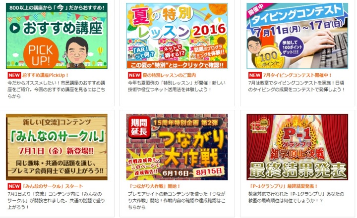 2016年07月15日 19:15 コメント 5 件 プレミアのトップページが長くのびました。こんばんは 豊橋教室のブログへようこそ! 今日は、信じられないぐらい、たくさんの方が教室にいらして下さいました。 受講時間数が、80時間を超えています。 \(◎o◎)/! もう、わけがわからない状態です。 本当に、いつもありがとうございます。 こんなにたくさん来ていただいているのにもかかわらず、 まだ、電話を差し上げている方もいらっしゃいます。 携帯電話に、着信があった方。 ぜひ、まだお席は空いておりますので、 ご連絡くださいね。(^-^) ~~~~~~~ 今日、15時ごろからプレミアサイトの トップ画面が下にたくさん伸びたのをご存知ですか? 今までの、トップ画面のバナーたちが、 ずらずらずら~~~~~ぁっと 下に並べられました。 ぜひ、いろんなお部屋をのぞいてみてくださいね。 今まで、どこから行っていいのかわからなかったお部屋も、 簡単に見つけることができますよ。 (^-^) トップ画面を、もう一度チェックしてみてくださいね。(^-^) ~~~~~ 今は、19時を過ぎています。 教室の中は、9名の方が受講をされています。 そのうち、6名の方が、一生懸命タイピングをしていらっしゃいます。 とってもいい、タイピングの音が部屋中に広がっています。 コンテストも、あと二日・・・。 まだまだ、頑張れます。 ご予約は、お電話でも承っております。 (^-^)