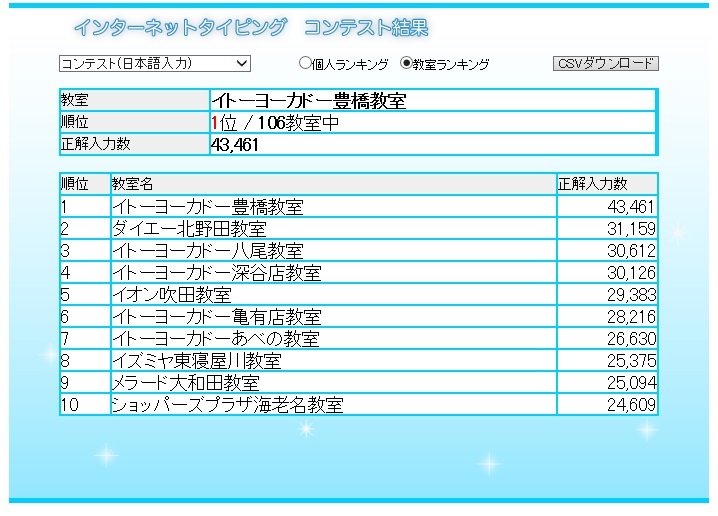 2016年07月17日 17:19 コメント 7 件 夏のタイピングコンテスト終了こんにちは 豊橋教室のブログへようこそ! 夏のタイピングコンテスト ご参加ありがとうございます。 あっという間の、一週間。 タイピングコンテストも無事に最終日を迎えることが出来ました。 この一週間たくさんの方に、挑戦していただいたタイピング。 前回の自分を超えたくて、一生懸命頑張ってくださって、 本当にありがとうございました。 今回は、前半思ったように順位も上がらず、 水曜日には冷や汗が出そうでしたが、 金曜日には、皆さん三連休前にひと頑張りしてくださって、 一気に、順位が上がっていきました。 P-1グランプリといい、タイピングといい 本当に、チーム豊橋の団結力にいつも感謝しています。 これからも、皆さんと一緒に頑張っていきたいと思いますので、 次回、秋のタイピングコンテストまで 腕を磨いておいてくださいね。(*^^)v 秋のタイピングコンテスト 10月11日(火)~10月17日(月)の予定となっております。 <m(__)m>