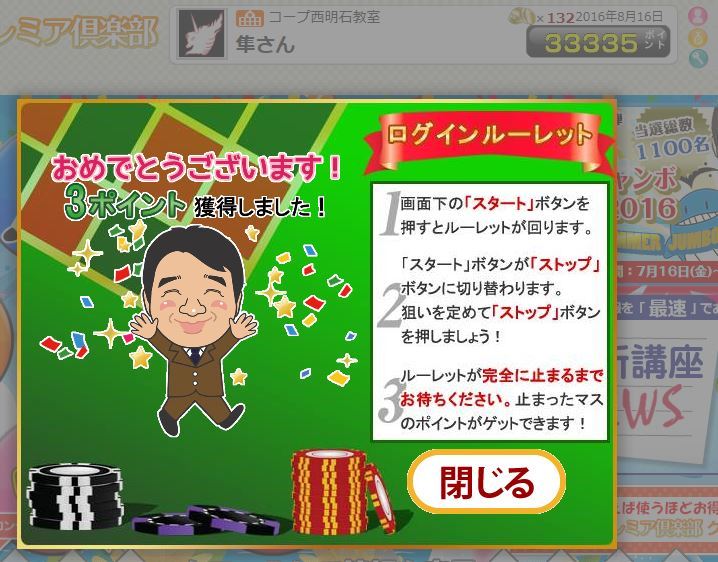 2016年08月01日 08:04 コメント 3 件 やってきました、ルーレット。ルーレットですよ〜 いきますよ〜 スタート! クル、クル、、 クル、クル、、 クル、クル、、 クル、クル、 ストップ! ・・・ ・・ ・ ・ おめでとうございます! 2ポイント獲得です。 めでたくないよ〜〜 まだ、10ポイント出たことないよ〜〜 いつまで続く、 10ポイントでたことない組、 では、いきますよ〜 お決まりの… 10ポイントでたことない組、 集まれ〜〜〜〜〜〜〜〜〜〜〜〜〜〜〜〜(*^o^*)