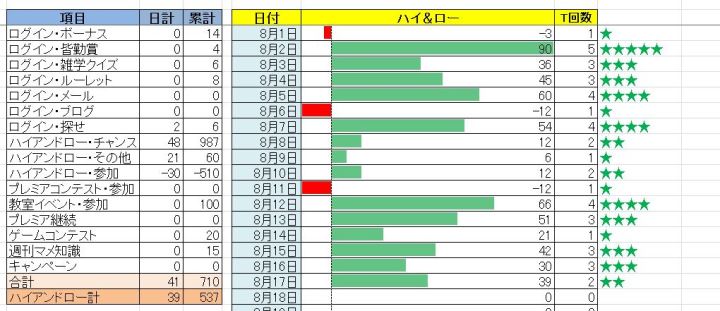 最近のハイアンドローゲーム・・ 先月29日、30日、31日、と今月1日、 ダブルチャンスが一回しか取れず・・ ビハインドが続きました。 しかし、手堅くまとめて、マイナスポイントを少なくすることにしました。 以前にマイナスを取り返そうと、無理な戦いを挑み、 ストレート負けしたので^_^; 今日は、ファーストのダブルチャンスを5回ゲット!! 一気に挽回です(^_-)-☆ 隼の打ち方では、そんなに大勝もしませんが、 続ければ、プラスになります。 図1 今月のスコア表 図2 先月のスコア表 図3 グラフ