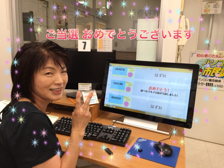 こんにちは 豊橋教室のブログへようこそ! 今日は待ちに待った、プレミアサマージャンボ宝くじの当選番号発表日。 みなさん、もうご覧になってくださった方も多いですよね。 ? まだって、それはいけない。 当選番号を確認するのは、トップページの一番上のバナーから。 まだ、確認されていない方はぜひ今すぐ確認してみてくださいね。 今朝、一番で受講して下さった皆さんには、 その場で当選番号を確認していただきました。 そうしたら そうしたら そうしたら 何と、【選べるグルメ目録】に当選された方が、なんといらっしゃいました。 全国で10名 たった10名様が当選されるという、グルメ目録。 もちろん目録だけではないですよ。 なんでも選んでもらえます。 そのグルメ目録が当選されたのは、 クッキングママさんです。 クッキングママさん、ご当選おめでとうございます。(^-^) クッキングママさん、プレミアの宝くじ 全部で20枚持っていらっしゃいました。 上から数えて、15番目にあるくじが当選していたので ご本人も、「買ってよかった~。」っと呟いていらっしゃいました。(^-^) やっぱり当選の確率上がるんでしょうか? 当選した方は、クッキングママさんのように、 教室で私たちに教えて下さいね。 ご報告 お待ちしております。 賞品が準備出来ましたら、お渡しいたしますね。 (^-^)