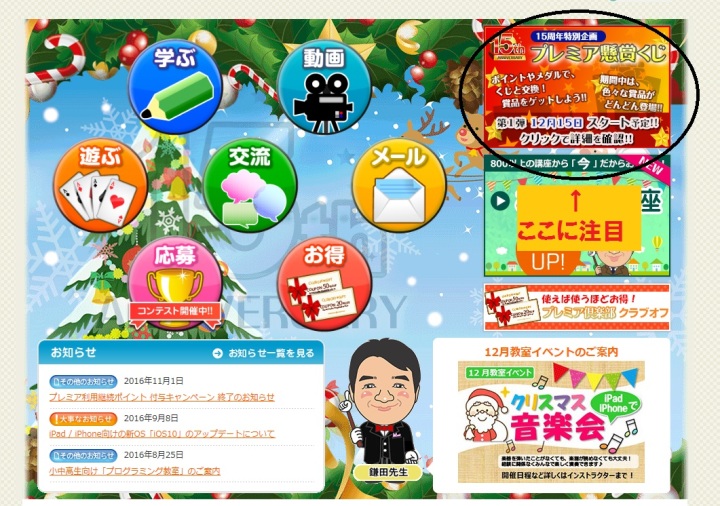 2016年12月05日 19:01 コメント 6 件 トップ画面を確認してね(^-^)こんばんは 豊橋教室のブログへようこそ! 12月になり、もう5日経ちました。 意外と思ったほど寒さは感じません。 これから寒波もやってくるのかもしれませんが、 年末の準備をする間は、あまり寒くなくてもいいですよね。 暖かいうちに、準備を進めておきましょう。 プレミアサイトのトップ画面バナーの確認はお済みですか? みなさんに、お得になる情報ですが、チェックしてますか? 内容は、トップ画面の一番上のバナーをクリックしてみてくださいね。 皆さんを含め私も大好きな、 「懸賞!!」って書いてあります。 何かが当たるってことです。 このブログを見たら、今すぐチェックしてくださいね。 今すぐチェックと言ったら、お得のボタンのクラブオフ。 最近覗いていただいていますか? クラブオフのプレゼントに、また食べ物がいっぱい帰ってきました。 夏場は、やっぱり食べ物のプレゼントが少なかったのですが、 冬になったら、肉やらカニやら増えてきました。 プレゼントの応募も、応募しない事には始まりません。 ついでと言ってはなんですが、懸賞の確認後は、 クラブオフのプレゼントの応募も、ぜひしてみてくださいね(^-^)