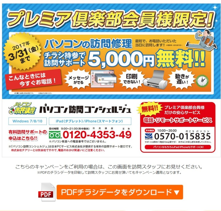 こんばんは 豊橋教室のブログへようこそ! 今日は、ずいぶん暖かかったようです。 昼間にいらした皆さんは、 「今日は、コートなくても大丈夫だよ。外は暖かいよ」 と、言っていらっしゃいました。 確かに教室の中も、暖房が無くても温かいです。 少しずつ春らしくなってきました。 でも、まだまだ油断大敵です。 只今、インフルエンザが大流行なのか、 このところ、インフルエンザでのお休みの方が続出。 みなさんも、気を付けてくださいね。 今日は、プレミアサポートセンターからのお得な情報。 みなさんは、トップ画面の下のバナーを確認してくれていますか? 只今、プレミアサポートサービスの訪問コンシェルジュがとってもお得! 訪問サポート料金が、5000円もお安くなります。 お安くなる方法は、トップページのバナーから チラシをダウンロードしてくださいね。 詳しい方法が分からない方は、教室の先生までお問い合わせくださいね。 普段困っていることがあれば、 この機会に訪問サポートを受けてみるのもいいですね。 これからは、移動も多い時期です。 ぜひ、困った時は利用してくださいね。 (^-^)
