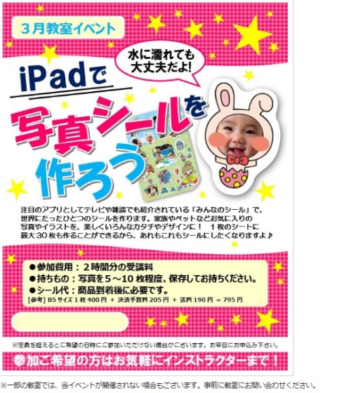 2017年02月20日 18:16 コメント 3 件 3月の教室イベント!こんばんは 豊橋教室のブログへようこそ! 2月もあとわずか。 3月のご予約はお済ですか? 3月のイベントは、写真シールを作ろうです。 見本の、シールを本日発注しました。 どんな仕上がりになるのか楽しみです。 今回は、ご自身で発注後シール代金をコンビニで払っていただくものになります。 かかるお金は、795円となります。 可愛い写真も使えます。 可愛くない写真も使えます。 お花の写真も使えます。 写真がなくても楽しめます。 3月の教室イベントへ是非ご参加下さいね。 開催日は、 3月16日(木)13:20~15:20 3月25日(土)10:20~12:20 の2回となります。 ちなみに、ipadを利用してのイベントです。 ipadがなくても、参加できますので 遠慮なく、参加くださいね。 ご予約お待ちしております。 (^-^)