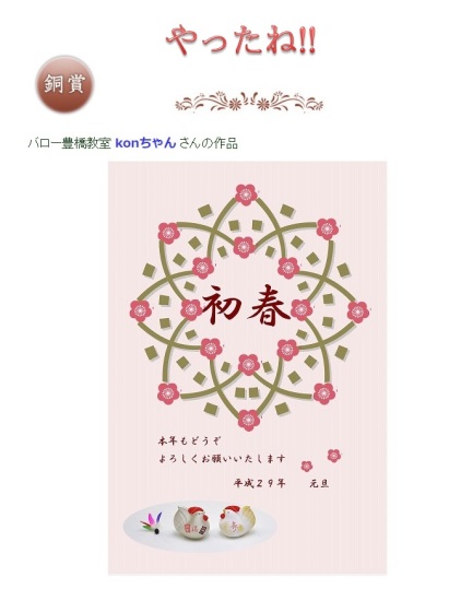 2017年02月24日 20:04 コメント 5 件 ★年賀状コンテスト結果発表!★こんばんは 豊橋教室のブログへようこそ! ちょっぴり寒いですね。 雨の後は、ちょっと寒くなりますね。 今日は、お待ちかねの年賀状コンテストの結果が発表されました。 もう、ご覧になっていただけましたか? みなさんが、投票して下さった結果です。 あなたが投票した方は、いかがでしたか? どなたの作品も、力作ぞろいで選ぶのに大変でしたよね? 投票結果を見て納得の作品ばかり。 そして、豊橋教室から唯一、一次審査を通過したkonちゃんさんのワードで作った年賀状。 見事に、銅賞に選ばれました!! おめでとうござます。 今日も、教室にいらしてくださいって、 先日参加して下さった、ワードでお絵かきで作成したしおりを たくさん作成されて、拝見させていただきました。 (この話題はまた後日ブログで・・・) いつも、いろんな工夫をされて素敵なカレンダーを毎月教室に持ってきてくださって、 私たちも、とっても嬉しくいただきます。 その成果もあってか、今回は入賞されました。 ぜひ、皆さんも選ばれた作品をご確認くださいね。(^-^) 次回のプレミアコンテストは、 3月1日から開始の 「川柳コンテスト」になります。 お題は、「春」です。 それでは、しっかり吟味してたくさんのご応募お待ちしております。 (^-^)
