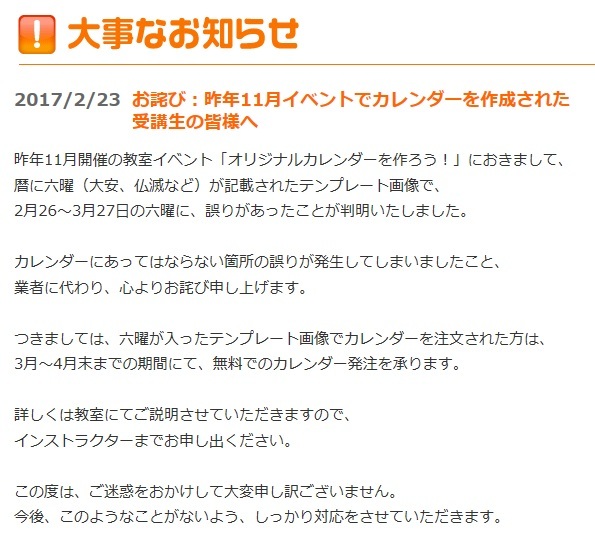 2017年02月25日 12:01 コメント 3 件 昨年カレンダーイベントに参加された方へこんにちは 豊橋教室のブログへようこそ! 今日は少し早目のブログの更新。 今日は、プレミアサイトのトップ画面にも記載されている お知らせからのご案内。 昨年、11月に開催しました、 カレンダーイベントで作成していただいたカレンダーの中で 罫線入り暦をご利用された皆さんのカレンダーの 六曜(大安・先勝など)が2月26日(日)~3月27日(月)までの間が、 1日ずれた表記になっていました。 大変申し訳ございません。 もう、明日からの事になるのですが、 ご自身の作成されたカレンダーで、 何かご予定を立てられた時に、 六曜をご覧になることがあったとしたら、すみませんが 他のカレンダーも確認していただけますでしょうか? 明日から1カ月間も、カレンダーで有ってはならない表記誤りがございました。 重ね重ね、大変申し訳ございません。 <m(__)m> 罫線入りの暦を利用された皆様で気になる方は教室までご連絡ください。 教室でも、ご案内をしておりますが、教室にいらしていない方もいらっしゃるので、 ブログにて案内をさせて頂きました。 大変申し訳ございませんでした。 お手数をおかけいたしますが、何卒よろしくお願いいたします。