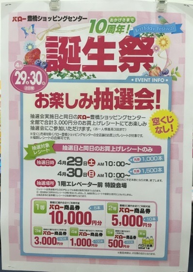 2017年04月29日 15:53 コメント 5 件 バロー豊橋店誕生祭!こんにちは 豊橋教室のブログへようこそ! いよいよGWがスタートしました。 教室前の、今日はにぎやかです。 朝から、スポーツDEPOさんにバーベキューセットを購入しにいらっしゃったと思わしき方がたくさん。 みなさん、すっかり半そでを来て、夏らしくなってきました。 夏らしくと言えば、日差し。 いまどきの日差しは紫外線がたくさんです。 日焼けをしすぎないように気を付けて、アウトドアを楽しんで下さいね。 (^-^) 今日から、バロー豊橋店では、「10周年誕生祭」がスタートしました。 4月29日・30日の両日 バロー豊橋ショッピングセンター全館で 当日購入されたレシート金額3000円以上で、 お楽しみ抽選会に参加が出来ます。(最高3回まで抽選可能) 抽選時間は、朝10時からスタートです。 抽選には、数に限りがあります。 本日は、1000本と言うことで、本日の抽選会は終わりとなっております。 明日も、朝10時から抽選会がスタートして 1500本終わるまでとなっております。 教室でのご入金の際も、領収証をお渡ししますので、 それをもって、抽選会場に出向いてくださいね。 抽選会場は、1階のエレベーター乗り場前となっております。 因みに、空くじなしとなっております。 (^-^)