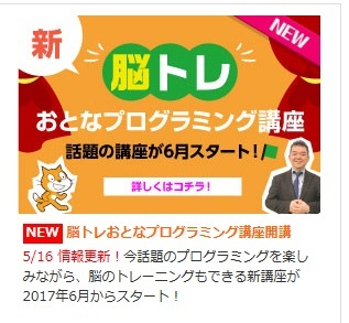 2017年05月16日 19:23 コメント 3 件 6月からの新教材!こんばんは 豊橋教室のブログへようこそ! 気が付けば、5月も半分過ぎました。 間もなく6月。 近頃、ちょっと曇りがちではないですか? 梅雨のシーズンも近づいてきましたね。 夜になると、カエルの声聞こえてきて夏間近ですね。 今日は、皆さんプレミアのトップ画面でもう確認済みかと思うのですが、 新教材のご案内となります。 といっても、 プレミアサイトトップページのバナーの中をのぞいていただければ、 特に教室からのご案内はないのですが、 まだ確認されていない方もいらっしゃるのでご紹介。 6月より、新 脳トレ 大人のプログラミング講座Vol.1がスタートします。 パソコン市民講座では、 子供のためのプログラミングスクール STAR Programming SCHOOL という、子供向けのプログラミング教室があります。 そこでは、年長さんから高校3年生までのお子様方がプログラミングを学んでいます。 今回は、そのプログラミング教室でも利用している、 スクラッチという、プログラミングアプリで、 大人の皆様には、脳トレをしていただこうということで、 6月より新講座をご用意いたしました。 詳しいことは、プレミアトップページのバナーからご確認くださいね。 今日は、6月からの新教材のご案内でした。