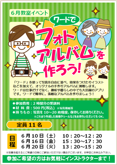 こんにちは。パソコン市民講座 バロー豊橋教室です。 教室では6月ご予約受付中です。 まだの方はお早めにお願いいたします。 そして、6月イベントのご案内です。 6月はワードでフォトアルバムを作成します。 手作り感のあるアルバム作成に挑戦しませんか? ご予約お待ちしています! ・・・・・・・・・・・・・・・・・・・・・・・・・・・・・・・・・・・・・・・・・・・・・・・・・・・ ★6月 ワードでフォトアルバムを作ろう! 6月10日(土) 10:20~12:20 余裕あり 6月16日(金) 15:30~17:30 余裕あり 6月20日(火) 13:20~15:20 あとわずか ※材料費500円が必要です ※写真を10~20枚程度保存してお持ちください ・・・・・・・・・・・・・・・・・・・・・・・・・・・・・・・・・・・・・・・・・・・・・・・・・・・ そして、先日もご案内した5月のイベントも まだ間に合いますので、こちらもご参加お待ちしています。 5月・6月と両方参加するとより一層楽しめます。 ・・・・・・・・・・・・・・・・・・・・・・・・・・・・・・・・・・・・・・・・・・・・・・・・・・・ ★5月 パソコンで写真加工をしよう! 5月20日(土)10:20~12:20 5月24日(水)15:30~17:30 ※写真を10枚程度、SDカードやUSBメモリに保存してお持ちください。 ・・・・・・・・・・・・・・・・・・・・・・・・・・・・・・・・・・・・・・・・・・・・・・・・・・・