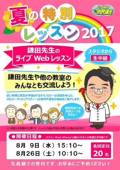 2017年07月02日 15:07 コメント 3 件 8月の予約受付スタートこんにちは 豊橋教室のブログへようこそ! 暑いですね~。 週末は雨模様の天気予報が先週出ていましたが、 ほぼほぼ雨は降りません。 降らないどころか、ほぼ真夏です。 暑い・・・・。 夕べはちょっと薄いお布団で寝たら、今日はちょっと調子が悪い・・・。 これって、寝冷えでしょうか? 今朝起きた時に、体が意外と冷えて足熱頭寒が理想なのに、 足冷頭寒になっていました。 皆さんも、体調管理は気を付けてくださいね。 (^-^) 8月の予約がスタートしました。 8月は、毎年恒例になった「夏の特別レッスン」が開催されます。 今年も、暑い夏を一緒に教室で乗り切りましょうね。 ご予約の取り方。 1.予約表をもらったら、夏の特別レッスンの日程をチェック! (今年も、3レッスン。かまた先生 プログラミング 写真のデジタル化) 2.どのレッスン日ならば参加できるかチェック! 3.その場で特別レッスンの予約を入れましょう! (3レッスンご参加の方には、プレミアポイントが100ポイント進呈になります。) 万が一、日程が立たない場合は、翌受講日にご予約をくださいね。 特別レッスンのご予約は、電話でもメールでも受け付け中です。 参加人数に限りがあります。 先着順になるので、お早目のご予約をお願い致します。 (^-^)