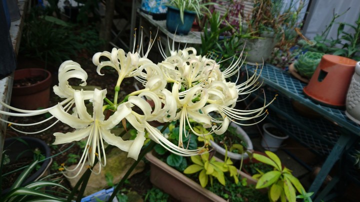こんにちは 豊橋教室のブログへようこそ! 気が付けば、今はシルバーウィークだったようですね。 そこに、台風がやってきているという、とっても悲しいモードなんですね。 教室は、毎日開講中ですので、あまり休日感もなく過ごしております。 そんな教室ですが、新しくなっても風が強くなると、 どこからともなく風の音がしてきます。 現在の豊橋は、雨もなく薄日のさす中、暴風警報が発令されているので、風がとても強いようです。 本格的な、台風は夜になってからだと思われます。 豊橋の皆さんは、夜の外出は控えた方がよさそうですね。 今朝は、庭に白い彼岸花が咲きました。 白色の球根を昔いただいたことがあるので、我が家では赤も白も咲きます。 今朝は、白い方が目に付いたのでブログのネタに、撮影しました。 彼岸花は、本当に不思議とお彼岸の近くになると、 咲き始めて、咲いてから気が付くといった感じですよね。 赤いのが彼岸花。 白いのは、彼岸花と鍾馗水仙(ショウキスイセン)が交配したものだそうです。 きっと台風が過ぎ去ると、一斉に咲き始めるんでしょうね。 (^-^)