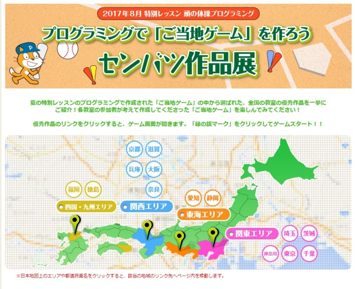 2017年10月05日 18:01 コメント 2 件 夏の思い出特別レッスンプログラミング!こんばんは 豊橋教室のブログへようこそ! ただ今教室では、秋のタイピングコンテストの模擬を実施中! ぜひ、腕試しの練習にいらして下さいね。 昨夜は、中秋の名月でした。 皆さん、お月さんはご覧になりましたか? 豊橋は、深夜になってから雨でしたので、遅い時間でない限り、 きれいなお月様が見えました。 月明かりもきれいで、素敵なお月様でした。 いよいよ明日は、満月です。 お天気がいいといいな~。 プレミアサイト、トップページを下にスクロールしていただくと、 新しいボタンができました。 この夏、皆さんに楽しんでいただきました、 夏の特別レッスンで「プログラミングで頭の体操」のレッスン内で、作成された全国の皆さんの、 選りすぐりのご当地ゲームが、アップロードされました。 各地のご当地名産品を、皆さんに当てていただくゲームです。 夏の特別レッスン、プログラミングに参加されていない方へ ゲームの仕方を教えますね。 知りたいゲームをクリックしたら、真ん中にいる、 Scratchキャットという名前の、猫ちゃんの上にある 緑の参画ボタンを押して下さいね。 そしたら皆さんの、キーボードの矢印キーの←と→のキーを利用して、 猫ちゃんを、その土地の名産品だと思う方へ動かしてください。 動かすのは、動かしたい方向に向いた矢印キーを 押していくだけです。 正解すれば正解と、間違っちゃうと間違ったと、 名産品が教えてくれます。 さあ、秋の夜長です。 ゲームでご当地名産を当ててみてくださいね。(^-^)