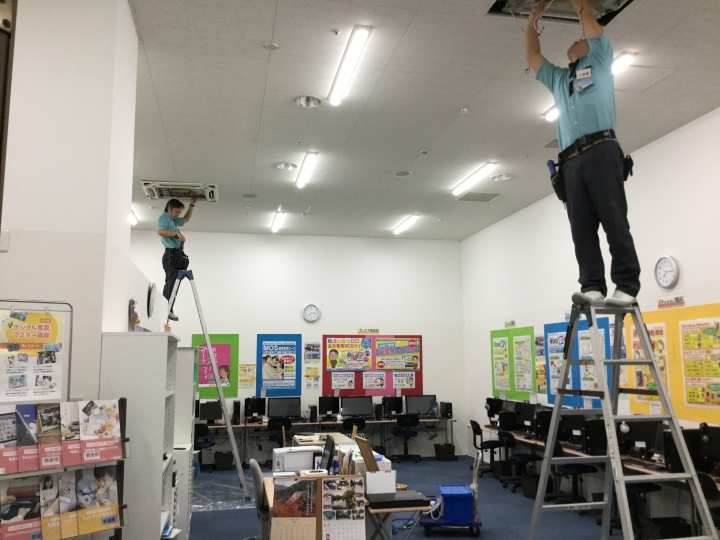 こんにちは 豊橋教室のブログへようこそ! 今朝は、朝からブログの更新。 といいますのも、今日は教室のエアコンのお掃除をしていただいております。 作業が始まって、30分ぐらいたつのですが、 エアコンが順番に解体されて行っています。 新しい教室にきて、もう少しで一年。 今朝はエアコンの内部のお掃除をしていただいております。 普段では、絶対にできないお掃除。 エアコンの部品がひとつづつとられていくのを見ていると、 信じららないぐらいの汚れ・・・。 一応写真に収めてはみましたが、それはもう素敵なほどの汚れ。 天井の高いところにあるから見えないだけですが、 これほど汚れているとは思わなかったので 今回本当にお掃除していただけて良かったです。 今日は、ダスキンさんにお願いして、 早朝より4名の方がいらしてくれて、 一生懸命エアコンと格闘してくれています。 教室の天井は、4mぐらいの高さなので 男性の方が脚立に乗っての作業も、本当に大変です。 お掃除のためのアイテムがとても素晴らしい。 さすがプロは違いますね。 ということで、今日の朝の授業は1時間遅れてスタートします。 まだまだ掃除は始まったばかりです。