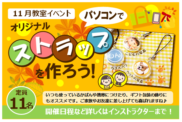 こんばんは。パソコン市民講座 バロー豊橋教室です。 11月イベントのご案内です。 ★パソコンでオリジナルストラップを作ろう! 11月18日(土) 10:20~12:20 11月24日(金) 13:20~15:20 11月29日(水) 15:30~17:30 お気に入りの写真でオリジナルのストラップを作ります。 いつも使っているかばんや携帯につけたり、 ギフト包装の飾りにもおススメです。 ストラップは3つまで作成できるので、 ご家族やお友達に差し上げても喜ばれますね♪ 材料費:850円(税込) ご予約お待ちしています!