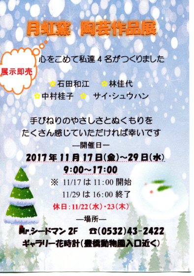 こんにちは 豊橋教室のブログへようこそ! 三連休の最後の日ですね。 雨も、ちょっと遠慮してくれてよかったですね。 先週先々週と、台風の襲来でいろんな行事が残念なことになってしまいましたね。 保母さんをされている方が10月22日の豊橋祭りが中止になったことで、 本日園児たちの鼓笛のパレードを公園でしてきたんです~。 っと、言っていました。 台風の影響は、まだまだ残っているようです。 ^^^^^^^^ そして別の生徒さんから、 趣味でされている陶芸教室の展示会の案内を、ワードで作ったから・・・。 っと、陶芸展示会の案内をいただきました。 ご本人から了承を得て、本日のブログに乗せました。 豊橋教室の皆さんで、お時間が取れる方は、 ぜひ、動物園前にある園芸屋さんのMrシードマンへ行ってみてくださいね。 2階のギャラリーで開催されるそうです。 その方が、まだ作品が出来てなくって・・・。 とおっしゃっていましたが、 きっと展示会のころには、完成していると思います。 皆さんも、教室で習ったことを活用して、 案内文など作ってみてくださいね。 出来た作品は、ご自身でブログの更新をしていただけると、 これまたプレミアサイトの活用もできていいと思います。 今日は、渡りに船とばかりに、教室ブログに登場していただきました。 (^-^)