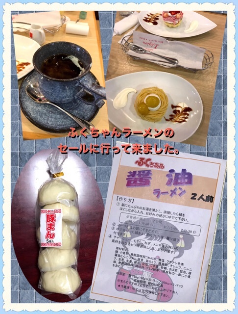 昔と言っても、10年ほど前まで、真菜とよく食べに行った、 大阪ラーメンの工場の、セールの広告が ポストに入っていました。 懐かしくて、真菜と一緒に行って見ました。 チラシの地図では、そう遠く無いようだったので、 自転車に乗らずに歩いて行きました。 地図の方角を間違えて、随分大回りをして行き着いた時は、 1時間ほど歩いていました。お目当のシュウマイは売り切れで 仕方なく豚まんを買いました。 豚骨ラーメン 餃子 チヤーシユウそれに根切りのもやしと 青ネギの小口切り キムチ等買い込んで、 真菜にリュックで背負わせて、帰りました。 結構歩いて、休憩にケーキ屋さんのレジエールでお茶しました。 真菜は苺のモンブランセット 私は♡懐かしモンブラン♡ と言う名のモンブランセットにしました。 帰って一息ついた所で、豚骨ラーメンを作ってね〜〜 久し振りの懐かしい味でした。