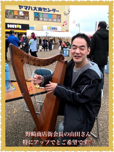 今日はお天気が良かったし、 風も無くて暖かい良い日でしたね〜 台風18号で中止になっていた、大東市民祭りの、 ガラガラ抽選会が、今日 住道駅前の広場で行われました。 12時から~5時まで屋台の店も出て、 抽選には列も出来ていました。 真菜と特等は圧力式電気炊飯器…有るから要らんなぁとか TVは置くとこないよね〜とか… くじ運の無いのにしようもない話をして抽選に行って来ました。 案の定、前の人は白玉で三等…私は、赤玉で見事に5等…… 即ち末等でした。貰ったのはスナック菓子一袋でした。 貰って、その場を離れたら、ハープを弾いているお兄さんが居て 一度鳴らしてみて下さいってね〜 ぽろろ〜んって鳴らしたら、 ここで抽選に漏れた方を癒してますって 正に漏れた方ですよって大笑いでした。 其れで写真を撮らせて貰ったら、野崎の商店街の会長さんで 写真ブログにアップしますよと言ったら、宣伝になるので 是非お願いしますと頼まれて仕舞いました。面白いですね〜 屋台のコーヒー屋さんの良い匂いに惹かれて注文しました。 中々に拘りのお兄さんで豆は7種類くらいあったかなぁ グヮテマラを頼んで淹れて貰いました。その場でミルで挽いて ペーパードリップで手つきがサマに なっていましたね〜(^ー゜) 雑味が無くて美味しいコーヒーで感想を言ったら、 解ってくれて嬉しいですって此方もOKなのでアップしますね。 ほのぼのとした楽しいふれあい祭りでした。