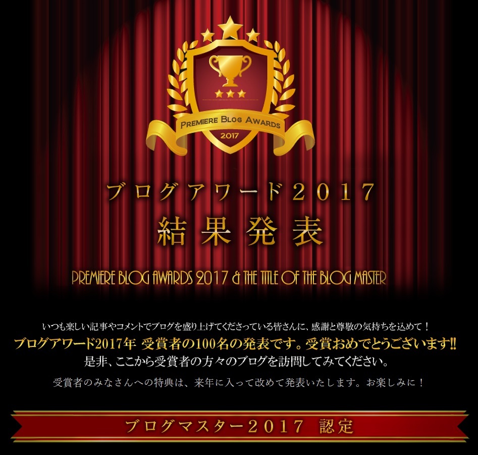 2017年12月20日 12:40 コメント 2 件 ブログアワード2017受賞者発表!こんにちは 豊橋教室のブログへようこそ! 12月20日です。 今年も残り、10日ぐらいになりました。 何もしていない私にも、年末も新年も来るんですよね~。 と、思っていても始まらないので、お掃除するとか年賀状を作るとか、 行動しないとね! 気忙し無い時期ですが、バタバタしないように落ち着いて行動したいと思います。 今日は、プレミアブログアワードの受賞者の発表日です。 もうご覧になっていただけましたか? プレミアトップ画面の、右下に 「ブログアワード受賞者発表」のバナーがありますよ。 そこから、確認していただけたらと思います。 豊橋教室からも、お二人ブログの達人たちが ブログマスター2017に認定されました。 おめでとうございます。 お二人とも、いつもこまめにブログを更新され、 お友達からのコメントもいただき、私も更新を楽しみにしております。 これを機に、普段は、なかなかブログを書く機会のない方も、 年末年始の情報やら、愚痴やらでいいので ぜひブログの更新してみてくださいね。 来年のブログマスター目指して、今日からスタートしてみましょう。 皆さんのブログ、楽しみにお待ちしております。(^-^)