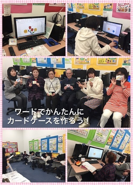 2018年02月13日 19:34 コメント 4 件 ワードでかんたんにカードケースを作ろう!こんばんは 豊橋教室のブログへようこそ! 今日も、とっても寒い日になりました。 午後から出勤だったんですが、お昼に自宅を出るころに ちらほらと小雪が舞っていました。 もう少しの辛抱ですよね? きっと・・・。 今日は、2月の教室イベント 「ワードでかんたんにカードケースを作ろう!」の 2回目のイベントを開催いたしました。 ワードの図形を利用して、クマさんや花などが描けるのですが、 操作に慣れるまでがちょっと大変です。 でも、作成していくうちに少しずつ楽しくなってきて、 思っていたような絵が描けると、やっぱり嬉しくなってくださるようです。 自分で作成した絵を利用して、最後はカードケースを作っていくのですが、 それぞれ個性のある作品が仕上がります。 今日もみなさん、楽しく完成されました。 次回は、17日土曜日の午前になりますが、満員御礼となっております。 あしからず・・・。