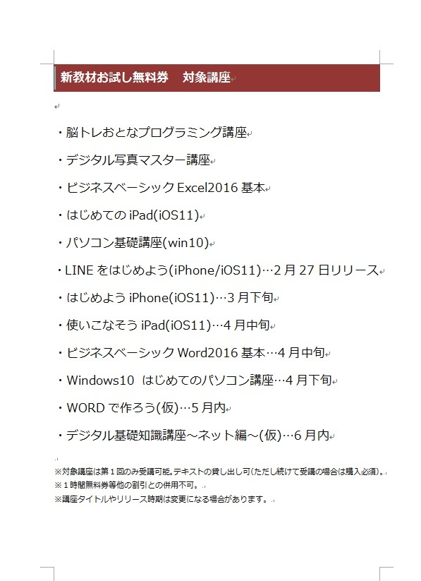 2018年03月03日 15:01 コメント 3 件 無料お試し券使えますよ!こんにちは 豊橋教室のブログへようこそ! 今日は、3月3日お雛様です。 耳の日だったり、耳かきの日だったり平和の日だったりもします。 今夜は、お雛様のお祝いで、ちらしずしだったりおすましだったりのご家庭もありますよね。 私も、お雛様のちらし寿司と茶碗蒸しがとっても好きでした。 お雛様といえば、和菓子よりもちらし寿司がメインの思い出です。 昔から、食い気の方が上回っています。(^-^) 先月よりお渡ししております 「お試し1時間無料受講券」 3月よりご利用していただけます。 使用期限は、6月30日までにお願いします。 利用方法は、「新教材」と記載されている赤紫色の券は、 最近新しく始まった教材をお試しで1回無料で受講していただけます。 受講の内容を掲載しておきますね。 新しい教材をぜひ体験して、スキルアップにご利用ください。 そして、青色の方の券は 「教室イベント」1時間無料券となります。 こちらは、3月・5月・6月の教室イベント参加時にご利用していただけます。 両方とも、他の無料券との併用は不可となっております。 1時間無料券をご利用の際は、無料券を提出してくださいね。 そのうち使おうと思っていると忘れちゃいます。 ぜひ、早めに計画を立ててくださいね。