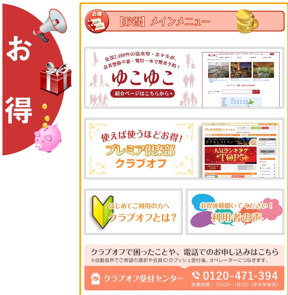 2018年03月05日 19:29 コメント 3 件 お得に仲間が増えました。こんばんは 豊橋教室のブログへようこそ! 今日は、すごい雨が降ったようですね。 教室にいらした方が、「前が見えないぐらいすごい雨だよ!」 っと、おっしゃっていました。 明日は、少し冷え込むってipadのお知らせに表示されていました。 三寒四温でしょうか? 今年の春は、のんびり三ですかね? 今日から、プレミアサイトのお得に、仲間が増えました。 一度ご覧になってくださいね。 今までの、クラブオフに「ゆこゆこ」っという、新し仲間が増えました。 ゆこゆこでは、全国の温泉やホテルのご予約が取れるサイトとなっております。 通常の旅行サイトより、とっても見やすい画面でいろんな宿泊先を確認していただけます。 ゆこゆこの特徴は ①全国2,400件の温泉宿・ホテルが利用できる! ②平日お得に利用できるプランが満載! ③会員登録不要で電話一本で予約が可能!ネット予約特別プランで更にお得に! という、素敵な内容となっております。 ぜひ、皆さんも「お得」のボタン覗いてくださいね。(^-^)