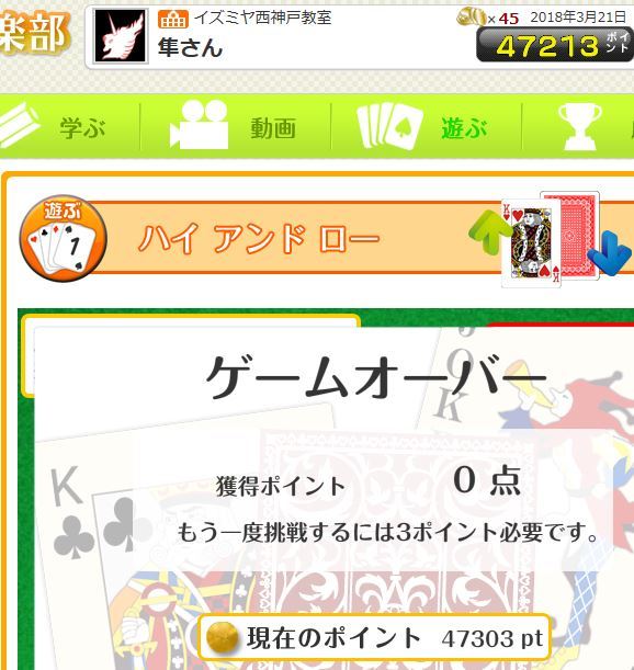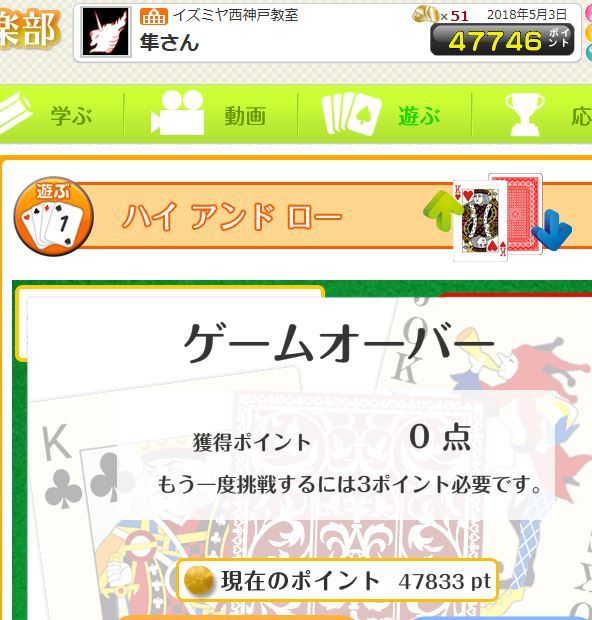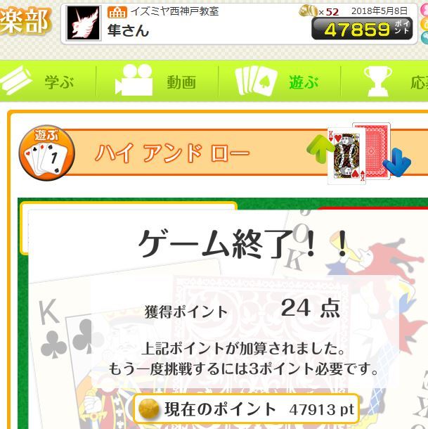 最近、さっぱりだったハイアンドロー。。 立て続けにジョーカーが2回なんて、ざら、、 ウソだろ~~ と言いたいようなシーンが続出、、 しかし、、 この二日間は、好調!! ダブルチャンスを手堅く決め、 ポイントアップ(^_-)-☆ ゲームばかりしてないで・・ 大使のお仕事は!! (-_-)/~~~ピシー!ピシー! ↑ ↑ ↑ 教室の先生