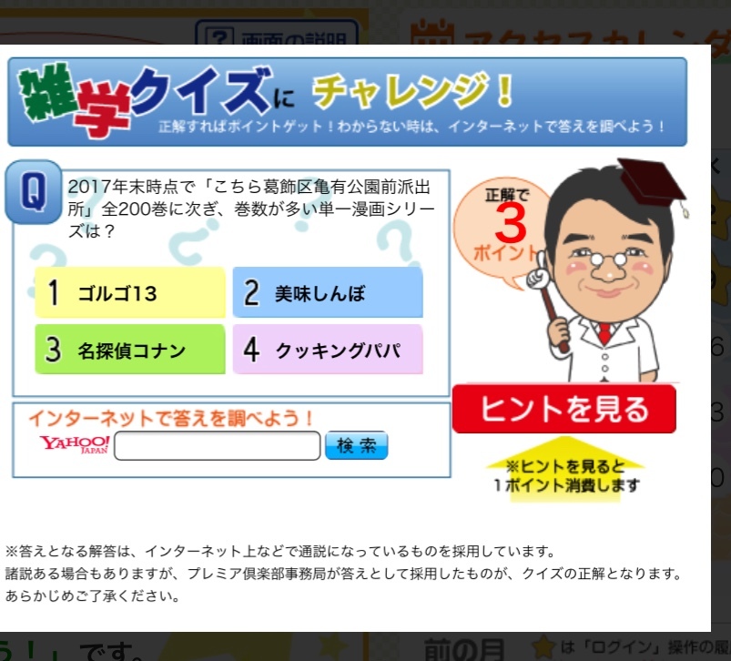2018年05月16日 23:42 コメント 0 件 雑学クイズ、難問をクリア?単一の、ということなので。。 やっぱり、そうだろうと、思っていましたが、、 念のため、検索して、正解。 単一でなければ、ガンダムシリーズか?? しかし、選択肢に無し。 美味しんぼ、 当初から上から目線の決め付けが、問題。 続いてたの? 人気のコナンの巻数がわかれば、クリア。