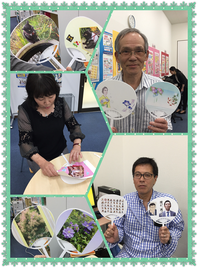 こんばんは 豊橋教室のブログへようこそ! 明日は、プレミア始まって以来初めての「リアル交流フォト散歩」の開催日です。 お天気がちょっぴり心配ですが、何とかなりますよね。 明日、ご参加いただく皆さんは、しっかりと休んで明日に備えてくださいね。(^-^) 東京会場で、お目にかかれるのを楽しみにしております。 ~~~~~~ 今日は、教室イベント「オリジナルミニうちわを作ろう!」の最終回が開催されました。 今日は、12名の方のご参加で、教室は熱気にあふれていました。 夏の特別レッスンを思い出すような、にぎわいでした。 今日の皆さんは、はじめてイベントにでられる方から、ブログマスターやプレミア大使の方も参加され、 バラエティーにとんだメンバーとなりました。 さすがに、12名の方が一緒に何かをするのは大変で、 あっちこっちで呼び止められて、お待たせする場面も多くて、 すみませんでした。 それでも、思い思いのうちわが完成出来てよかったです。 今週末は、またまた30℃予想のようです。 作ったミニうちわをぜひご利用くださいね。 (*^^)v 来月の教室イベントは、「お気に入りの写真をアルバムにしよう!」となります。 まだまだ受付中です。 ぜひ、教室イベントお試し券で参加してみてくださいね。 (^O^)/