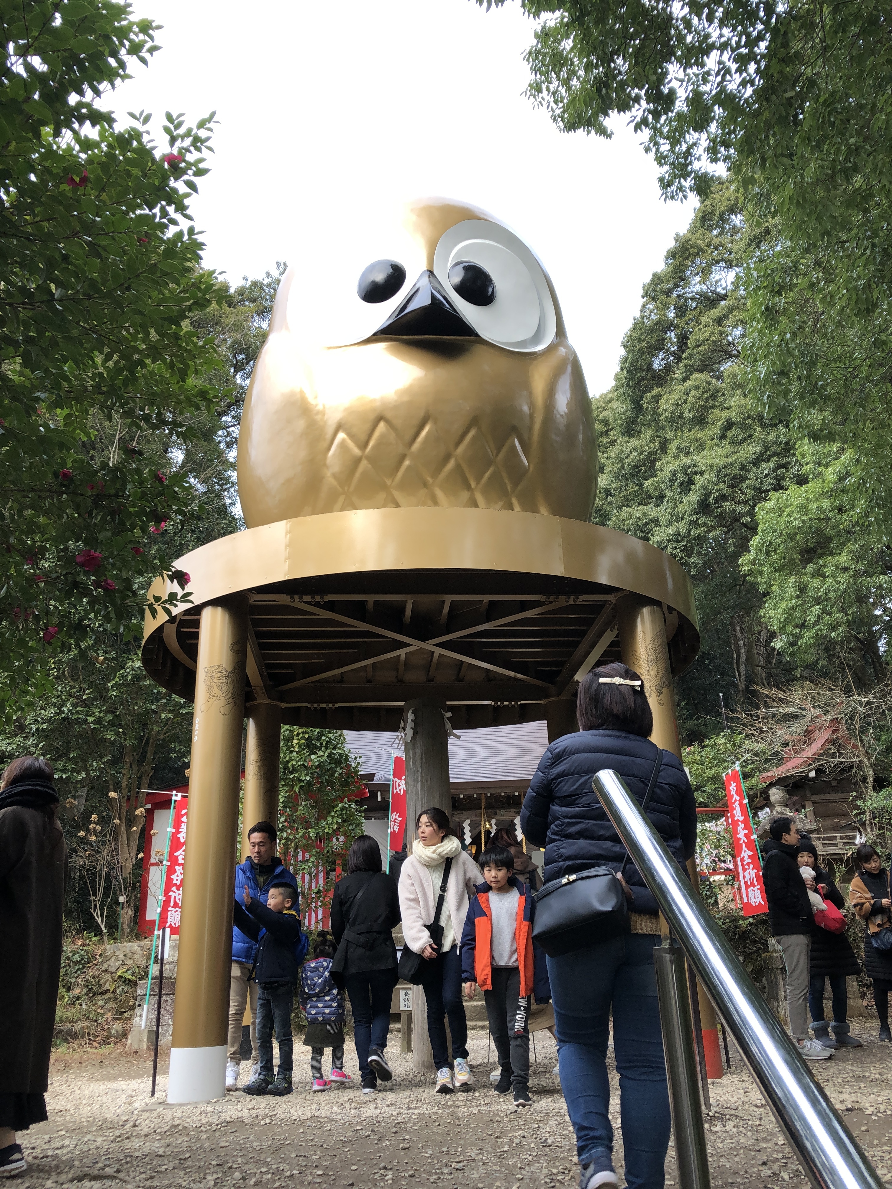 昨年は、幸運だったかと言えば〜 何か今一つで、タマ親父の目標は叶わなかった? 今年は、心機一転で 良い夢を見れるようにと神社に参拝した。 しかし初詣は、成田山新勝寺で無く近くの神社に〜 それも元旦ではなく、2日だった? 今栃木大田原市のホームコースのホテルに到着! 明日の月例競技会参加の為、前乗りだ〜 途中金運、勝負運が良いと評判の鷲子山上神社に混み合う中、 我慢して何とか参拝出来た! フクロウ(不苦労)の神社で験を担ぐ人は、毎年多く参拝するそうだ? フクロウのモニュメントが大小たくさんあり、 頭を撫ぜてとコメントが有る。 可愛いですよ! 今日いっぱい頭を撫ぜたので、 あしたの月例競技会は、御利益あるかも?笑 写真 鷲子山上神社のフクロウモニュメント