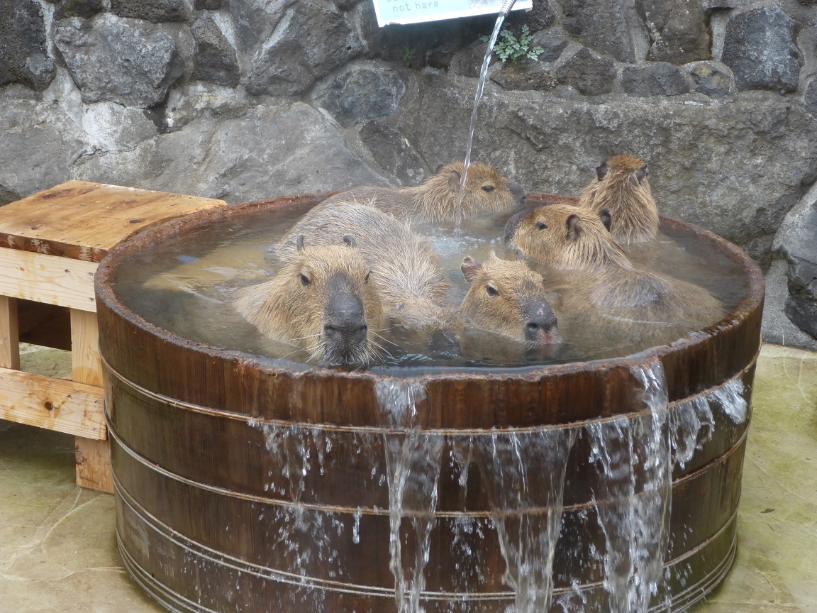 昨日早朝 日の出を見たくて、海の見える露天風呂へ しかし角度が悪くて、 露天風呂からは見えなかった! それでも白い波しぶきに青い空と海~眩しい! 食後ホテルの従業員さんに見送られて、目指すは 伊豆シャボテン動物園! 近くには大室山があり、ロープウェイが行き交っていた! ここのシャボテン動物園 凄く広い~ クジャクが羽広げて、カピバラも動き回っている? レッサーパンダも動き回っていて、可愛い! カピバラの入浴シーン 樽の中に6頭が押し合いつつも、気持ちよさそうだった? その他キリン、ろば、いのししなど動物好きは、時間を忘れることだろう? サボテンも沢山あり、小さなサボテンは販売していた! 可愛いが、育てるのが大変だから買わなかった! 写真 1枚目 カピバラさんの入浴 最初2頭だったが、後から       ボスが来て6頭で~    2枚目 クジャクが近づいて羽を広げる    3枚目 いたずら盛りのレッサーパンダ