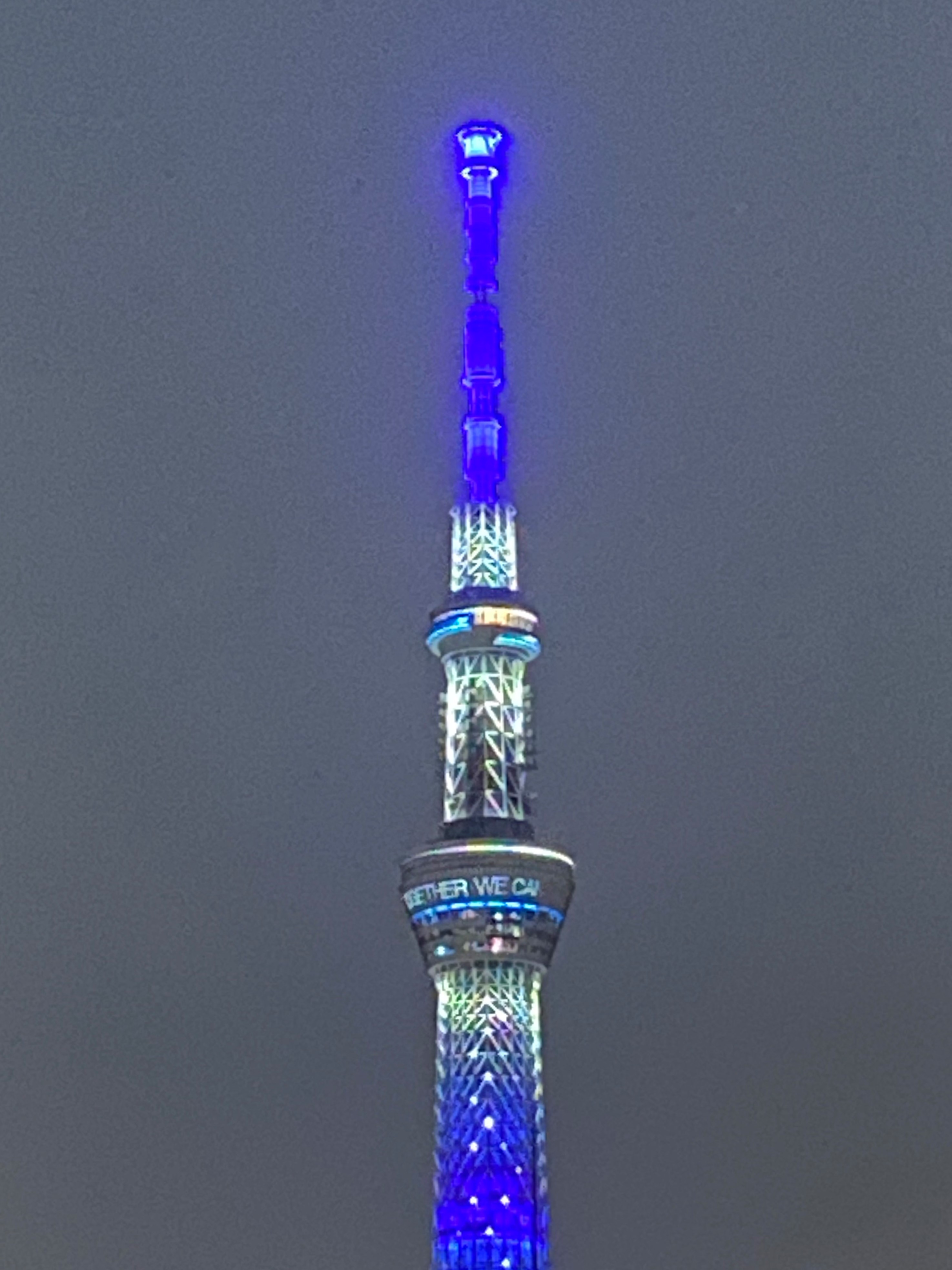 皆さん、こんばんは! 現在スカイツリーは、新型コロナウイルス感染症に、 「世界が一丸となって立ち向かい、みんなで打ち勝とう」 という思いを込めて、地球をイメージした青色の 特別ライティングになっています。 (スカイツリー及びソラマチは休業中) また、展望台には「Together We Can All Win」 (みんなで打ち勝とう)とメッセージも流れています。 スカイツリー以外にも東京タワーや都庁、そのほか多くの 世界中の施設で青色ライティングをしているようです。 今日からGWですが、もうひと頑張り。 一日も早い終息の為ステイホームです! ※明日は市民講座LIVE 第3回 14:15~ です。 ご参加お待ちしています!