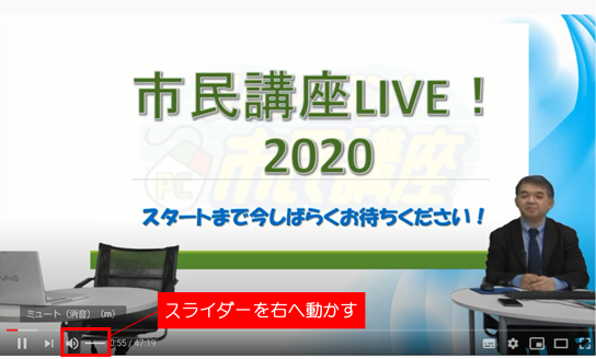 皆さん、こんばんは! 本日は市民講座LIVE第3回が開催されました。 またまた、最初の5分間音声が出ていませんでした。 申し訳ございません <(_ _)> その後も前回に比べて音が小さかったようです。 使用する機器によって違ったようですが、私はパソコンで 視聴していて音量を最大まであげました。 音量の調整ですが2段階あります。 まずは、≪写真1≫ YouTubeの画面左下にある 音量スライダーを右に動かしてください。 それでもまだ小さい時には≪写真2≫ PC画面の下、タスクバー右側にあるスピーカーを クリックして音量を調整して下さい。 市民講座LIVEも次回5月4日(月) 14:15~ が最終回。 あっと言う間でしたね。 さて、河俣が1週間担当してきましたが、明日からは 服部先生にバトンタッチします。 自粛がもうしばらく続きそうですが、この機会に 「プレミア倶楽部の達人」目指してみるのはいかがでしょうか? 1週間ありがとうございました。