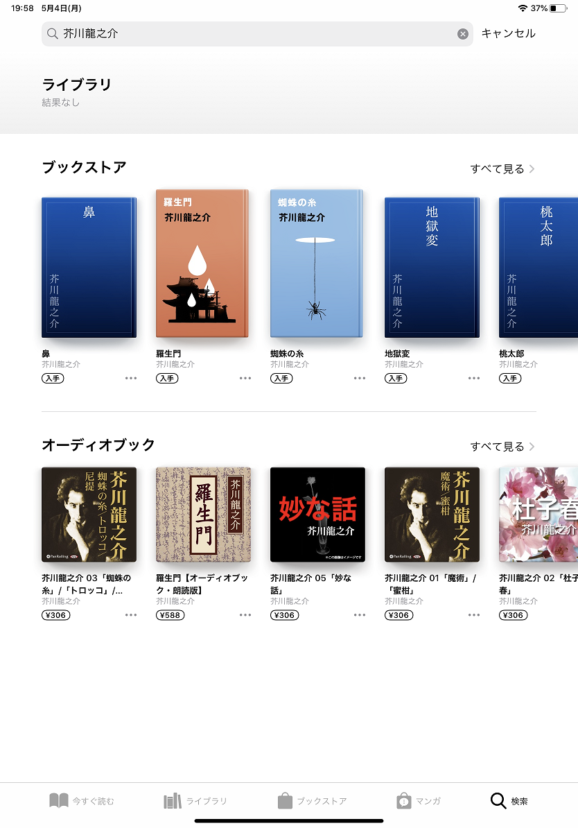 皆さんこんにちは! なかなか外に出ることができない今、 せっかくなのでゆったりお家で読書などはいかがですか? 読書ができるアプリは色々とありますが、 今回はAppleの純正アプリ『ブック』についてお話ししたいと思います。 本を読むにあたって、「やっぱり紙の方がいい」という方も多いと思います。 もちろん、私も最初はそうだったのですが、 やっぱり本を沢山を集めていくとどうしても本棚がいっぱいになってしまったり 大判の本は持ち歩きにくかったりと困ってしまう事も沢山ありました。 iPadで本を読むようになると、場所の節約になりますし 何よりも『本そのものが汚れず劣化しない』のも個人的には嬉しいと思いました。 ただ、「いきなり本を購入するのはちょっと…」という方もいると思いますので、 そういった方は、まずは『芥川龍之介』や『坂口安吾』等 無料で読める作家さんの作品を試しに読んでみてはいかがでしょうか? ブックアプリを開いた後、『検索』をタップし、 作家名を入力して探してみてくださいね! 慣れてきたらぜひ、色々な本に触れてみてくださいね。 楽しい読書ライフを!