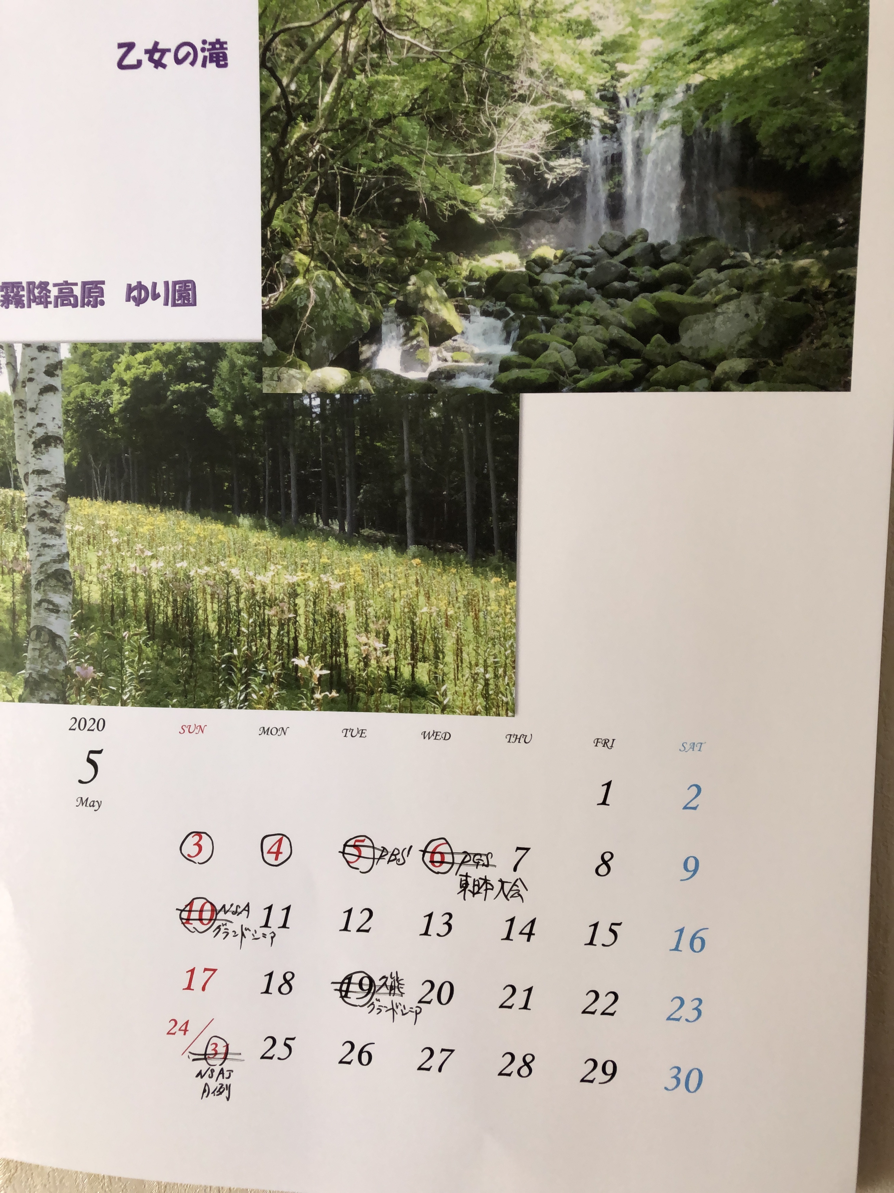 今日は5月6日 コロナウイルスで緊急事態宣言”が出ていたが、 本来なら解放される予定だった! しかし 少しづつ改善方向らしいが、今月末まで延長になった。 企業活動も徐々に解除方向に来ているので、サラリーマンも少しずつ動き出した! 三蜜に関わる傾向にあるものは、依然として自粛で休業は変わりない? 自分のスケジュールについては、ゴルフ競技は延期でなく 中止、学びの市民大学校が今年度は中止とのことだ! パソコン教室2か月休講等々~ カレンダーを見ると予定が消されてしまった! こころに空虚感が~ 何を目標にしたらいいのか~? 目の前に目標が無いと走れない~(笑) モチベーションが上がらないでいるタマ親父の最近だ!