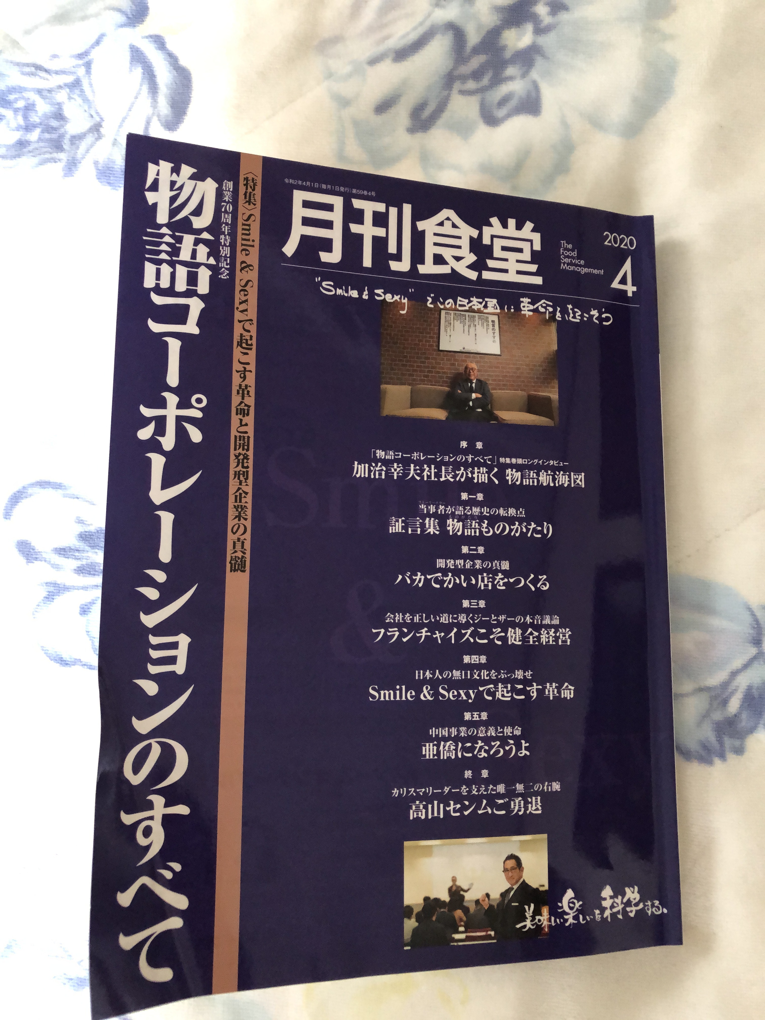 コロナ騒ぎで世界の経済がピンチのこの時期 旧知の友人から一冊の本雑誌が送られてきた! 国内外で約1,000店の飲食店を経営している会社の創業者! 物語コーポレーションという会社で、 焼肉キング、一番かるび、お好み焼き本舗、丸源らーめん 柚子庵(しゃぶしゃぶ店)源氏総本店(和食)その他 直営店、フランチャイズ店併せて400店が休業になっていた! 大変なピンチなはずであるが、経営幹部はもとより従業員の皆さん、変わらず元気だ? 5月連休明けにお好み焼き本舗にお邪魔したら、さすがにお客さんが少なかったが、明るくてきぱきと対応いただいて気持ちよかった! 今回タマ親父のために送っていただいた雑誌、月間食堂”という雑誌、全面に渡ってこの物語コーポレーションを紹介している! この会社のモットーは、それぞれの自己実現を目指して、 会社物語、自己物語を創ることである! 従って自由闊達な意見の交換し、いろんなことにどんどん挑戦するそんな社風だ! 飲食店は、三密に加えられ休業も余儀なくされていたが、 そんな時でも元気いっぱいで、応援団長を自認するタマ親父も 元気をもらっている。 写真 1枚目 ”月刊食堂”雑誌 に取り上げられた会社    2枚目 雑誌の中身の一部    3枚目 物語コーポレーションの創業者とタマ親父夫婦