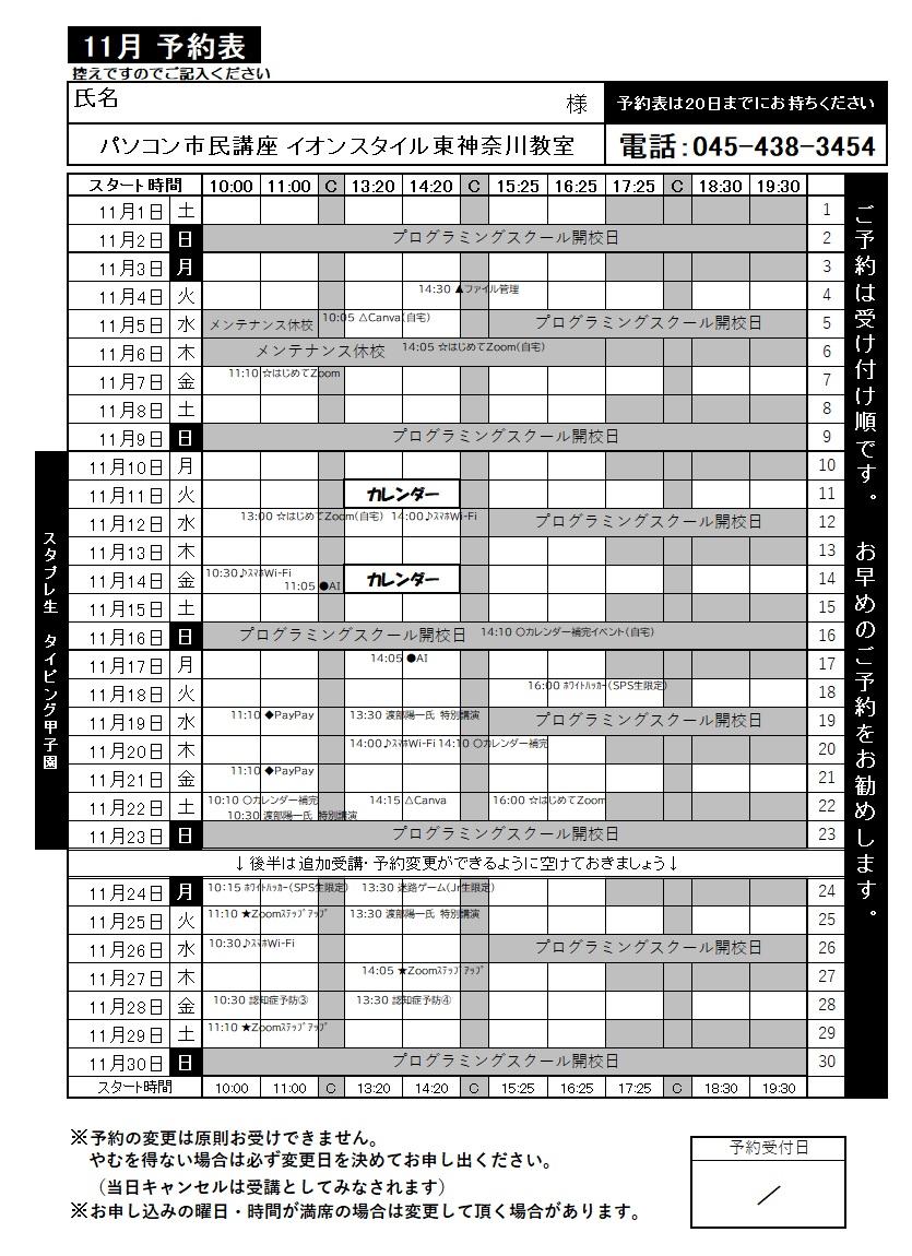 2025年08月27日 11:11 コメント 0 件 【重要】10月のスケジュールについて皆さまこんにちは~~ 8月ももう終わり。 学生さんはそろそろ夏休みも終わり。 9月からは少しずつ最高気温も落ち着いてきそうな予報になっていますね! とはいえ、まだまだ暑い日が続くようですので 熱中症対策を忘れずに! さて、10月のスケジュールについてお知らせいたします。 ★休校日★ 10/09(木) 終日 (メンテナンスのため) ★臨時開講★ 通常祝日はお休みをいただいておりますが、以下の日程で特別に開講いたします。 10/13(月) 10:00~17:25 ★イベント★ インストラクターお勧めのイベントをいくつかピックアップしました(^^♪ ~AI写真イベント~ 10/13(月) 10:00~12:00 AIに写真を生成してもらおう!! AIに頼めばプロ顔負けの写真が誰でも出来てしまいます!! 実際には存在しない美しい風景や人物を作って、AI生成とはどういうものか体験してみよう!! あなたの姿もAIで大変身させることが可能です。 是非、新しい扉を開いてみましょう(^^)/ ~スマ散歩~ 10/24(金)開催です スマホを持ってご参加いただく、リアルイベント! 新宿中央公園でスマホを使ったミッションを実施しながら散歩を楽しめる内容になっています。 いつも映像の中にしかいない鎌田先生や坪内先生に会えるかも!? 10月分の予約は9/1より受付開始です。 お電話でのご予約も承っておりますので、ご希望がお決まりの方はお知らせください。 なお、毎月のご案内になりますが、 土曜日はどの時間帯も大変人気で満席になりやすいです。 土曜日ご希望の方はお早めに!