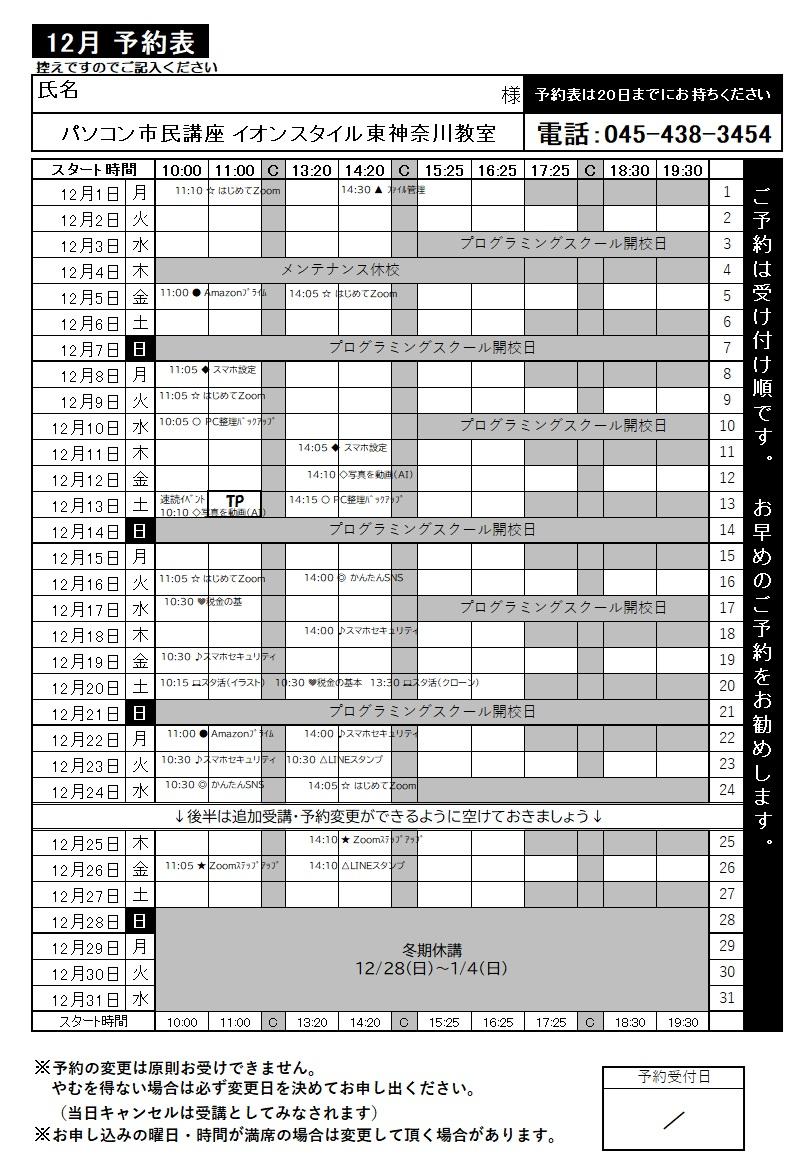 2025年11月01日 17:30 コメント 0 件 【重要】12月のスケジュールについて皆さまこんにちは(*'▽') 11月に入ったので、12月のスケジュールについてお知らせいたします ★休講★ 12/04(木) 終日(メンテナンスのため) ★年末年始休講★ 12/28(日)~1/4(日) ★イベント★ たくさんご用意しているイベントの中からインストラクターオススメのイベントをご紹介 (1)速読イベント 東神奈川教室では速読の受講生様を対象に速読のイベントをご用意しています。 ふだんは自分のペースでご受講いただいていますが、イベントの日はみんなでワイワイしながらトレーニングして頂くことができます。 速読コース受講中の皆さま、ぜひご受講くださいね! 12/13(土)10:00~ (30分程度) (2)タイピングアリーナ 小中学生の皆さまを対象にタイピングのイベントを開催! より上手に速く打てるようになるためのコツを伝授。 ゲーム感覚で楽しみつつ、コツを身につけていきましょう! 12/13(土)11:00~ (1時間) オススメのイベント以外もスマホやパソコンのイベント盛りだくさん! お教室では詳しいイベントのスケジュール表をお渡ししていますので、 早めに受け取りにいらしてくださいね! ご予約はお電話でも受け付けております。 お気軽にご連絡くださいませ。