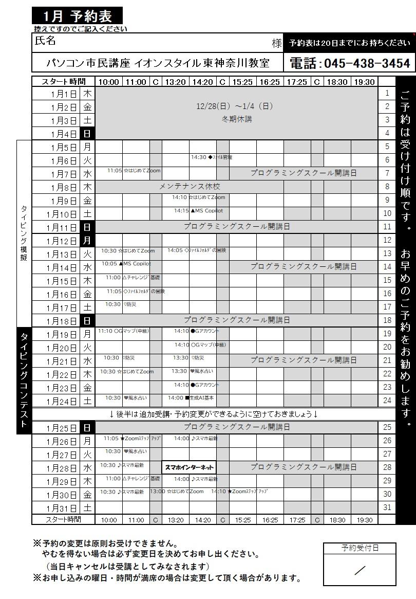 2025年11月24日 14:10 コメント 0 件 【重要】1月のスケジュールについてみなさまこんにちは! もう1月のスケジュールについてお知らせするタイミングになりました。 1年があっという間でビックリしています。 今年もあと1カ月。 まだまだ今年中にやっておきたい事が残っている方もいると思いますので、ぜひ1つでも多くの事にチャレンジしましょうね(^_-)-☆ とは言いつつも、1月のスケジュールについてお知らせいたします(^^♪ ■休講について■ ・2025年12月28日(日)~2026年1月4日(日)は年末年始の特別休講期間となります。 ・1月8日(木)はメンテナンス休講のため終日休講となります。 ■イベントについて■ 1月はいつもよりたくさんのイベントをご用意していますが、 その中からインストラクターのオススメイベントをご紹介♪ (1)風水で占う2026年 パソコンやスマホなどとは関連しないカルチャーイベントですが、毎年新年に行っている恒例のイベントです。 日々の生活に取り入れやすい実勢的なアドバイスをいただけますよ(#^.^#) <開催日> 1月22日(木)13:30~15:00 1月24日(土)10:30~12:00 1月27日(火)10:30~12:00 (2)スマホでインターネットを楽しもう 普段から使っているインターネットをより安全に楽しく使うためのコツをご紹介します! 10月からスタートした見逃し配信で事前に予習してから参加していただくと、より理解度がUPします。 まだご受講いただいてない場合はインストラクターにご相談くださいね! <開催日> 1月28日(水)13:20~15:20 (3)QTビジネス塾 1月からスタートする久古先生(大阪エリア)のビジネス塾。 仕事でつかえる便利技や実践的なテクニック等、生成AI活用術を徹底解説。 今回はchatGPTやGeminiなどの生成AI全般を学習予定です! <開催日> 1月24日(土)14:00~16:00 1月分のご予約は12月1日より受付スタートです。 お教室にいらした時はもちろん、お電話でのご予約も受け付けておりますので、ご希望の方はご連絡くださいね。