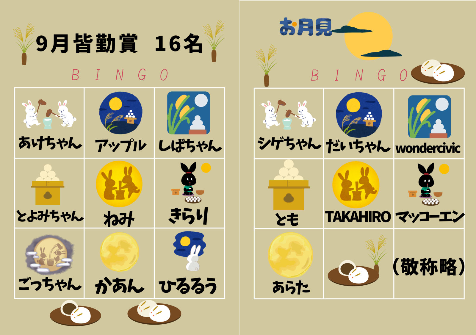 2025年10月01日 20:16 コメント 6 件 9月プレミアログインこんばんは(^o^)丿 今日から10月ですね。 もう年末まで カウントダウンが始まったような気がします。 9月のプレミアログイン結果を 発表しますね。 9月はお月見デザインにしてみました。 Canvaで「お月見」で検索すると お月見のビンゴのデザインが 出てきて、面白いなあと思い 作ってみました。 今日から11月の予約表を お配りしています。 11月はカレンダーイベント オンラインカルチャーに 渡部陽一さんの講演会 と盛りだくさんです。 皆さんご案内すると 「ああ、戦場カメラマンの人ね」と ご存じの方ばかりでした。 すでに何人かご予約をいただいています。 ZOOMが使える方は ご自宅からの参加もできます(^_^)/ 小松