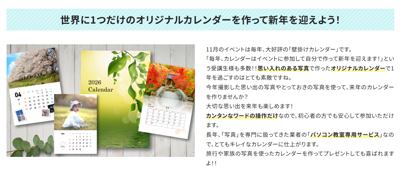 2025年10月05日 18:21 コメント 4 件 2026年のカレンダーを作ります!こんばんは(^o^)丿 11月のイベントのご案内です 毎年恒例の「カレンダー」イベントです。 日程は 11月3日(月)13:30~15:30 11月5日(水)13:30~15:30 です。 昨日は毎年作成している 小学生の女の子2人が予約されました。 お父さんの方から 「カレンダーイベント参加するんか?」と 娘さんにきいてくださり こちらからお誘いする必要がなかったです。 多分、皆が見えるところに カレンダーを飾ってくれてるのかなと思いました。 昨年も兄弟3人の写真をたくさん使った カレンダーを作成されました。 カレンダーはリング式なので 年が終わっても捨てるのがもったいないですね。 フォトブックを作成している会社に 発注するので印刷もキレイです! まだまだ予約受付中です! 小松