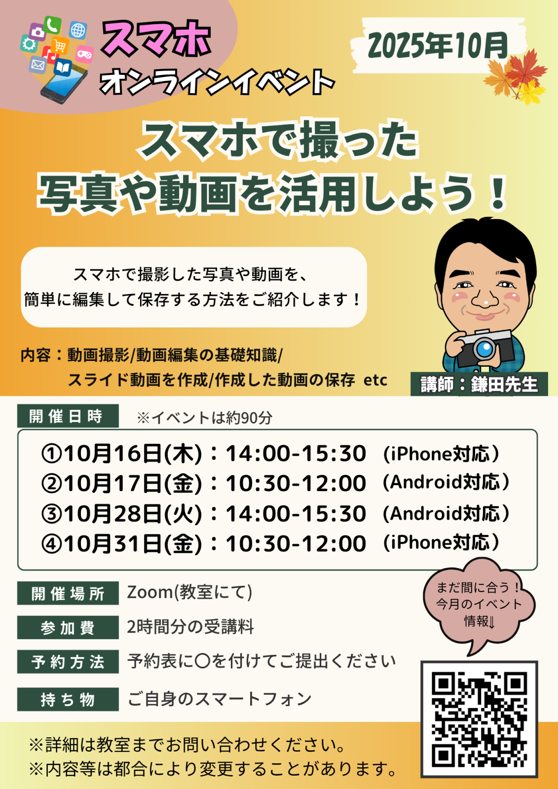 みなさんこんにちは! インストラクターの佐野です 10月のオンラインスマホのご案内です <10月オンラインスマホ> 「スマホで撮った写真や動画を活用しよう!」  ①10月16日(木): 14:00-15:30 (iPhone対応)  ②10月17日(金): 10:30-12:00 (Android対応)  ③10月28日(火): 14:00-15:30 (Android対応)  ④10月31日(金): 10:30-12:00 (iPhone対応)   ※iPhone・Androidで日程が異なりますのでご注意ください せっかく撮影した写真や動画、もっと素敵に活用してみませんか? また、今月の内容と日程はこちらです。 <9月オンラインスマホ> 「スマホをバックアップしよう!」  ①9月17日(水): 14:00-15:30 (iPhone対応)  ②9月18日(木): 10:30-12:00 (iPhone対応)  ③9月19日(金): 14:00-15:30 (Android対応)  ④9月24日(水): 10:30-12:00 (Android対応)   ※iPhone・Androidで日程が異なりますのでご注意ください スマホを使う上で、もしもの時のためのバックアップはとても大切です! 気になられていたみなさま、もうご予約はお済みでしょうか? ご予約お待ちしております!