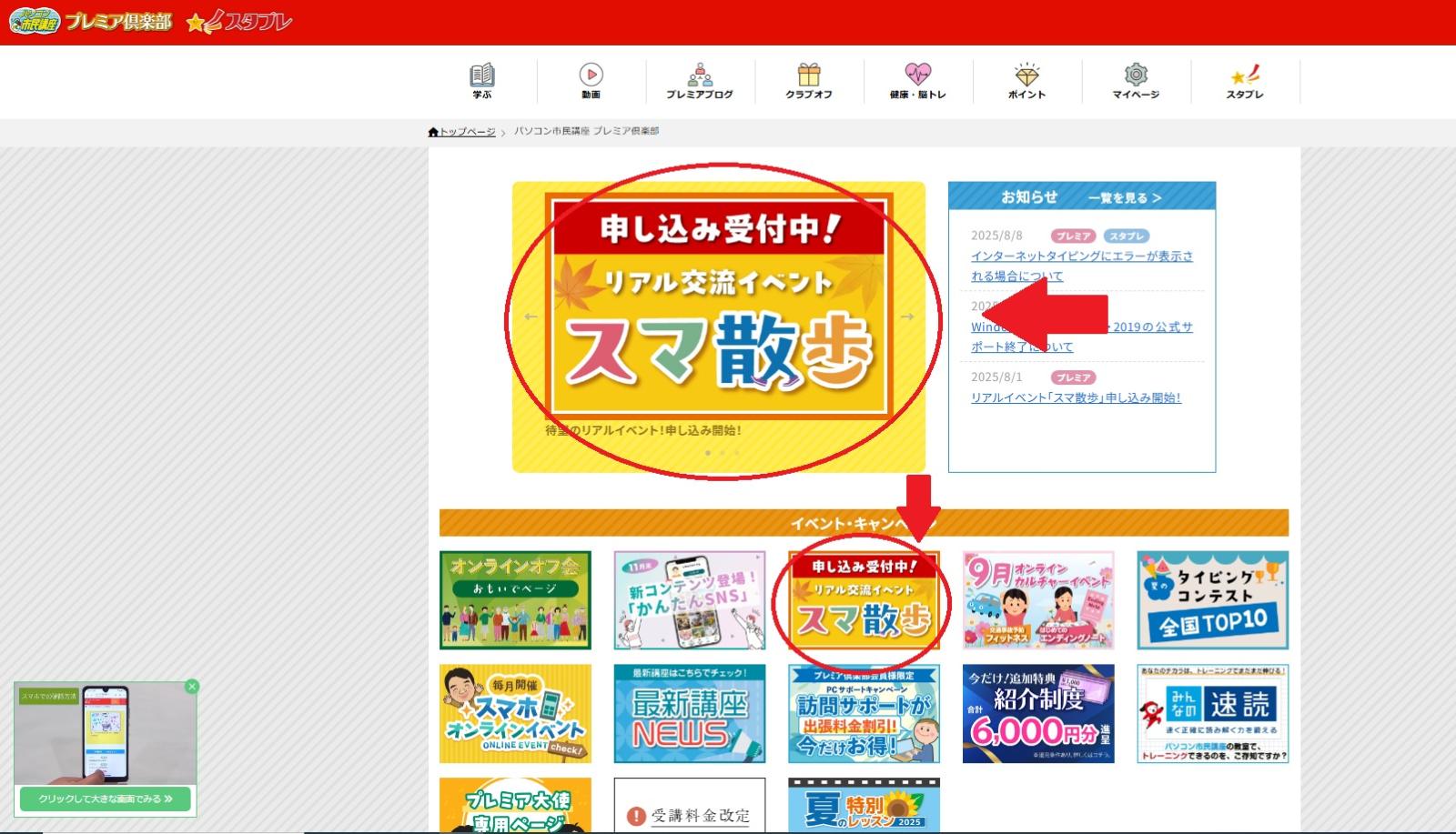 みなさん こんにちは。 インストラクターの新屋敷です。 早いもので、9月も半分が過ぎようとしております。 少しは気温が下がっているようにも感じますが、まだまだ暑い日が続いておりますので、 体調を崩されないようにご注意くださいね。 さて、6年ぶりのリアル交流イベント『スマ散歩』の申込期間が延長になりました!! 9月30日まで延長されています。 迷っていた方、日程調整ができた方は、是非ご参加くださいね。 詳しくは、プレミアサイトのトップページにあるバナーをクリックして確認くださいね。 交流をしながら、スマホミッションに挑戦! スマホがもっと楽しくなるヒントがいっぱいの特別な一日を過ごしましょう♪ 大阪会場は、中之島公園です。 日程は、10月21日(火)13:45~16:30 東京会場は、新宿中央公園です。 日程は、10:月24日(金)13:45~16:30 参加費用が必要になります。 締め切り日までに忘れずお申込みお願いします。 申込された方は、教室インストラクターにもお声掛けくださいね。 たくさんのご参加お待ちしております。