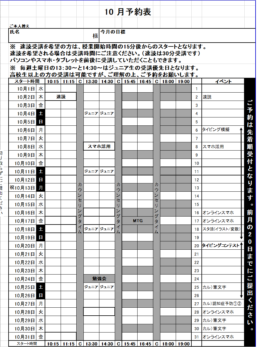 みなさん こんにちは。 インストラクターの高橋です。 急に涼しくなり、長袖を引っ張り出してきた今日この頃です。 西友はエアコンが入っているので、もしかすると教室は少し寒く感じる方もいらっしゃるかと思いますので、羽織るものをお持ちいただくといいかもしれません。 さて、9月も残りわずかです。 10月のご予約をまだされていない方は、忘れないうちにご予約をお願いします(^^)/ 10月はタイピングコンテストもありますので、「あっ!」と思われた方は、 今のうちからプレミア倶楽部のインターネットタイピングで練習をして、 コンテストで成果を出しましょう! また10月分の会費と受講料が、9月29日(月)に引き落としとなっております。 以前よりお伝えしておりましたように、会費については据え置き、受講料については価格改定をさせていただいておりますので、ご料金のご確認をおねがいいたします。 より良い学びの場を目指してまいりますので、どうぞよろしくお願いいたします。