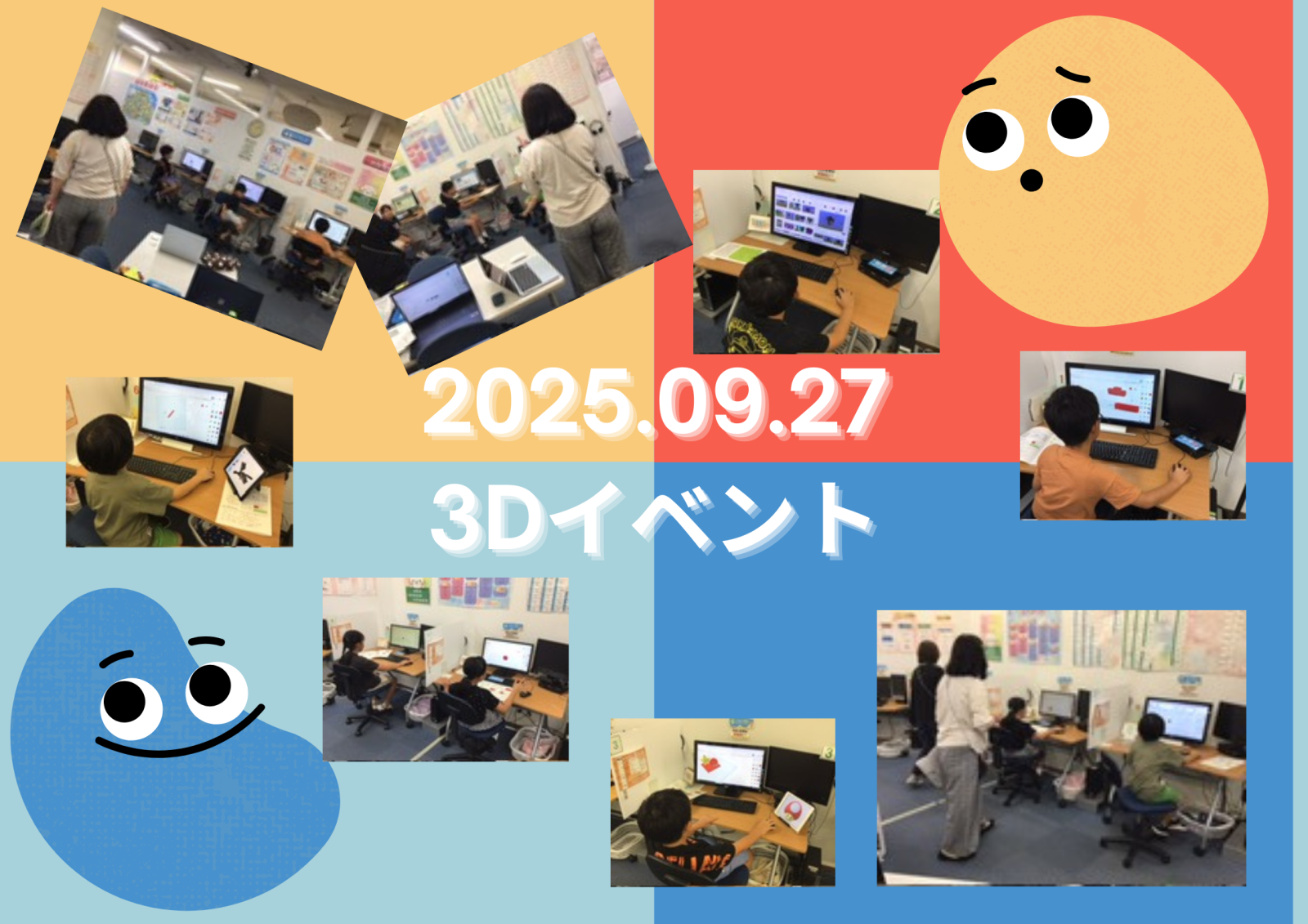 みなさん こんにちは。 インストラクターの新屋敷です。 朝夕が肌寒く感じる日が多くなってきましたね。 過ごしやすくなれば良いのですが、急に気温が下がってくると 体調を崩しそうになるので、上着を持って行動しないとなと思っています。 みなさんもご注意くださいね。 さて、昨日は子どもたちのイベント『3Dの「カタチ」を作ってみよう!』を行いました。 6名の子どもたちが集まってくれましたよ。 図形を組み合わせて、キャラクターを作ってみたり、動物を作ってくれました。 でき上がりは、10月に入ってからなのですが、みんな難しい操作もがんばって完成させてくれました。 いつも以上に楽しそうにしてくれたので、とてもうれしかったです。 説明を短く、作業を多めにしたので、しっかり作品をつくってくれました。 みんなの作品ができ上がるのがとても楽しみです。 参加されたみなさんは、楽しみにお待ちくださいね。 また、子どもだけのイベントも今後考えていきたいと思いますので、今回参加できなかった方も ぜひご参加くださいね。