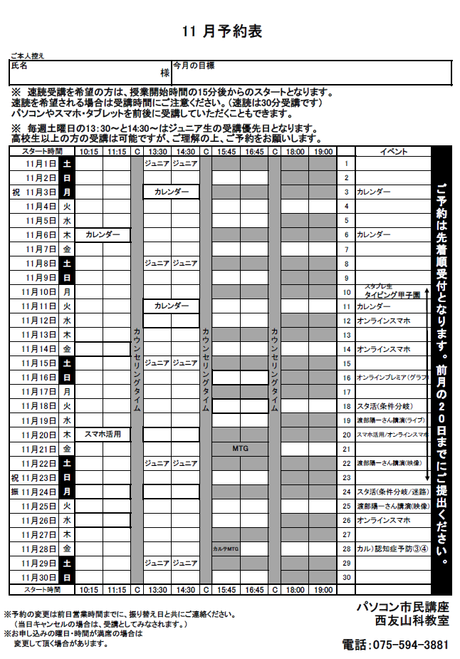 みなさんこんにちは。 インストラクターの平尾です。 今日は11月予約表とイベントのご案内です。 11月です。今年もあと数ヶ月になりましたね。あっという間に年末です。 今年中にあれやこれと予定していたものはできていますでしょうか? また、市民講座の教室で昨年末に立てた今年の目標は順調でしょうか^^ 目標達成に向けてまた教室でもお手伝いさせていただきますので、 お話お聞かせくださいね^^ 私の今年の目標は少しずつ進めておりますが... 目標達成に向けてペースアップをしたいと思います! では、11月の予約表とイベントです。 ◆壁掛けカレンダーを作ろう◆  毎年人気のカレンダーイベントです♪  お気に入りの写真、イラストでオリジナルの作品を作りませんか  11月 3日(月) 13:30~15:30  11月 6日(木) 10:15~12:15  11月11日(火) 13:30~15:30   ◆スマホ活用教室イベント◆  LINEで「写真のダウンロード」や「スタンプの購入」など  11月20日(木)10:15~12:15   ◆スマホオンラインイベント◆  Wi-Fiを理解しよう  Wi-Fiの仕組みやモバイル通信との違いをお伝えします。  ※教室からZOOMで参加します  11月12日(水)14:00~15:30  11月14日(金)10:30~12:00  11月20日(木)14:00~15:30  11月26日(水)10:30~12:00 ◆オンラインカルチャー◆    ❖今日から始める認知症予防❖  ※各回定員30名    11月28日(金)10:30~12:00 『MCI(経度認知障害)と早期発見の重要性』  11月28日(金)13:30~15:00 『認知症の正体とは?脳のしくみと関係性』  ❖秋の特別公演!❖  戦場カメラマンフォトジャーナリストの渡辺陽一氏  戦場の現場から祈りを捧ぐ  11月19日(水)13:30~15:00 【ライブ講演会】  11月22日(土)10:30~12:00 【録画映像上映会】  11月25日(火)13:30~15:00 【録画映像上映会】 詳しくはインストラクターまでお問合せください。 ご予約は、お早めのご提出をお願いいたします。 また、教室でお待ちしておりますね。